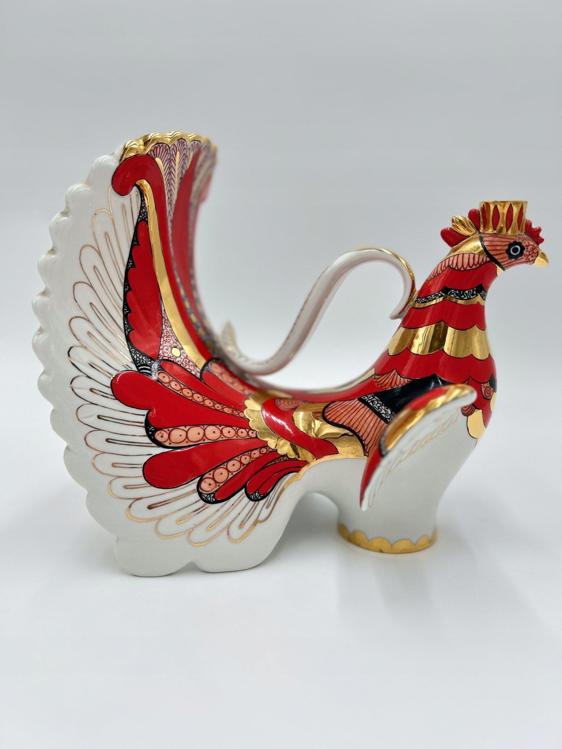 Предмет продажи — уникальный кувшин от самого узнаваемого Ломоносовского завода в мире. Кувшин в форме тетерева, колоритной птицы с распростертым хвостом, богато украшенный позолотой, окрашенной в красный и черный цвета. В хвостовике есть отверстие - по предложению оно издает звуки при наливании жидкости. 1950-е – 1960-е годы