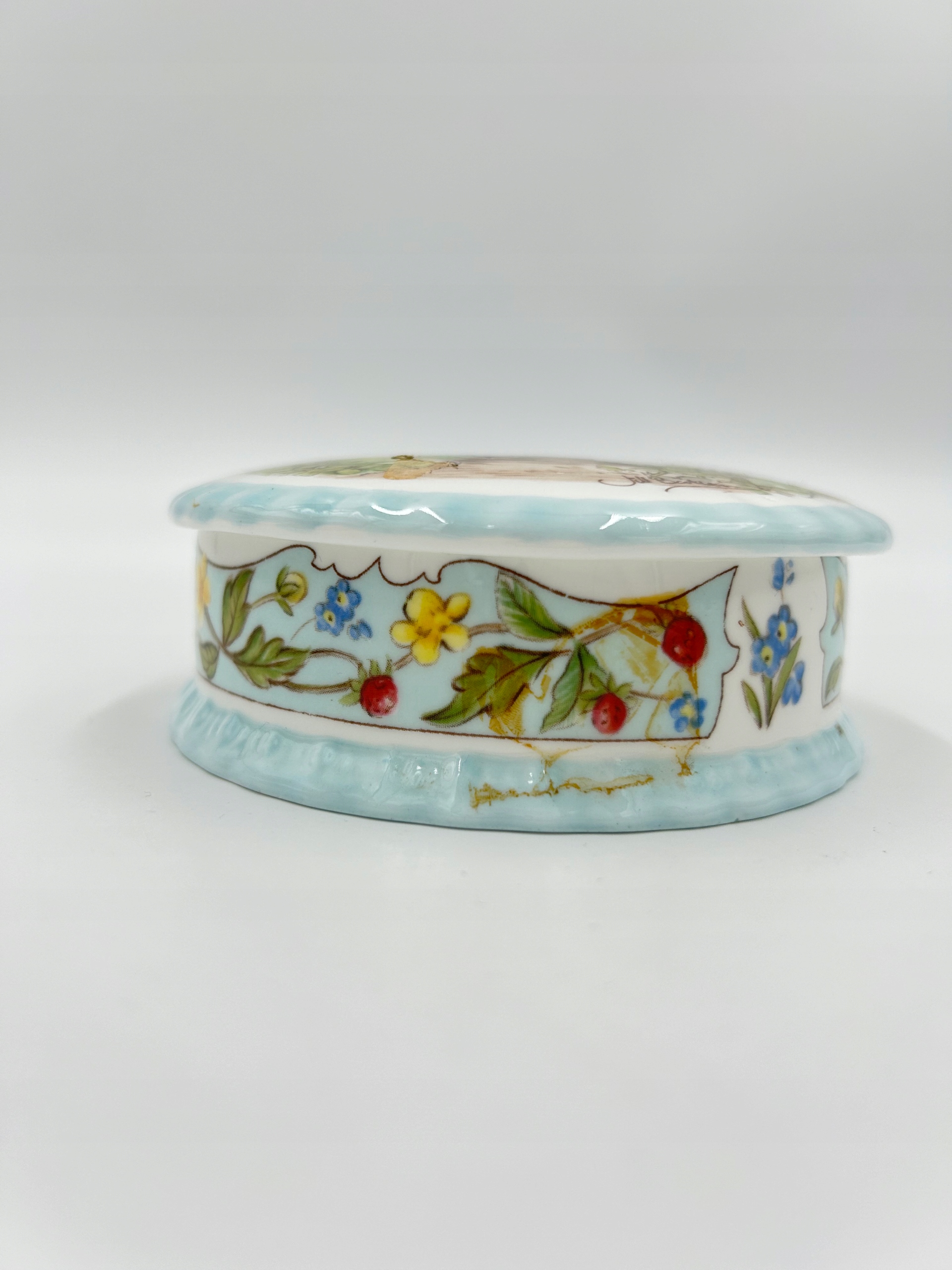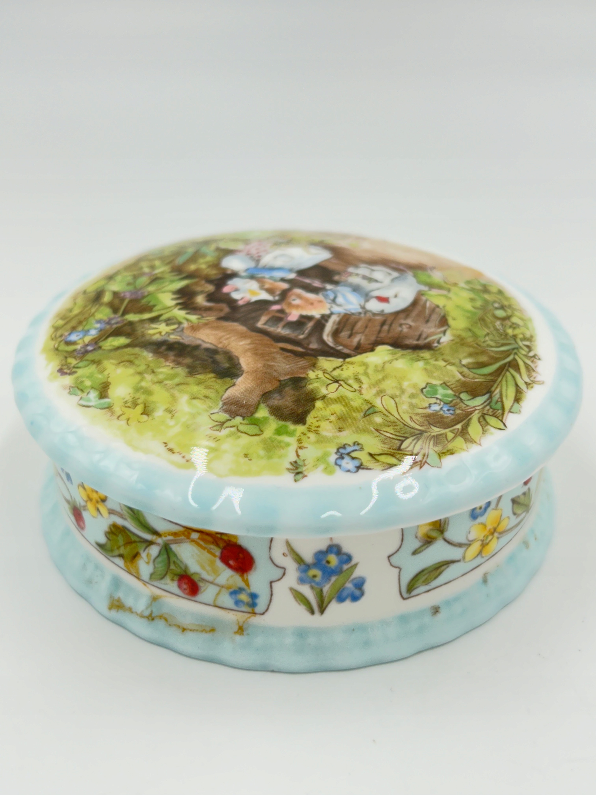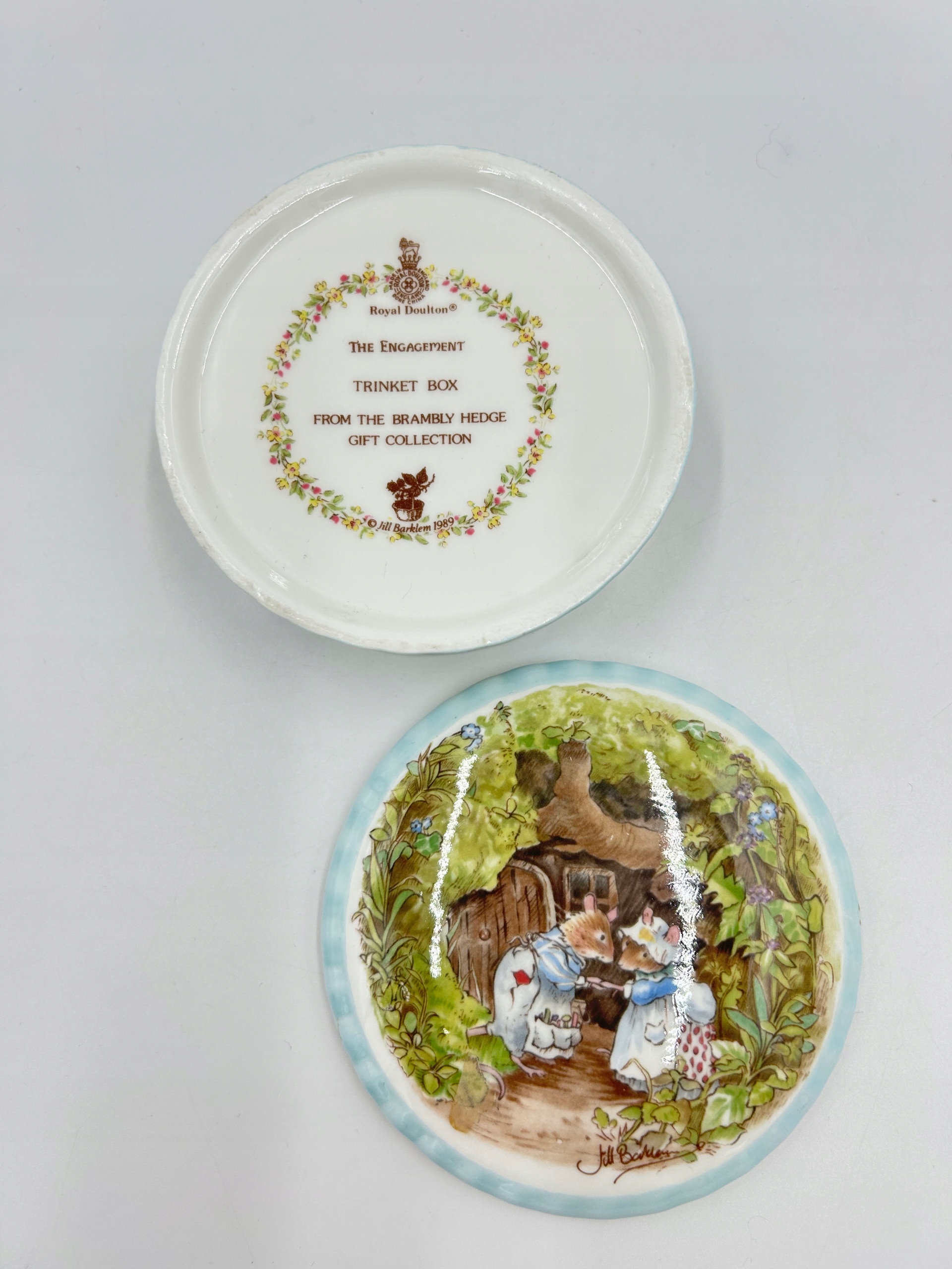 Предмет продажи - коллекционная шкатулка, круглая шкатулка для безделушек Royal Doulton - The Engagement - The Engagement с изображением персонажей Brambly Hedge, серии иллюстрированных книг для детей, рассказывающий о приключениях сообщества мышей, живущих вместе в мирной обстановке английской сельской местности. Автор Джилл Барклем представила Брэмбли Хедж как общество, полное любви и заботы.