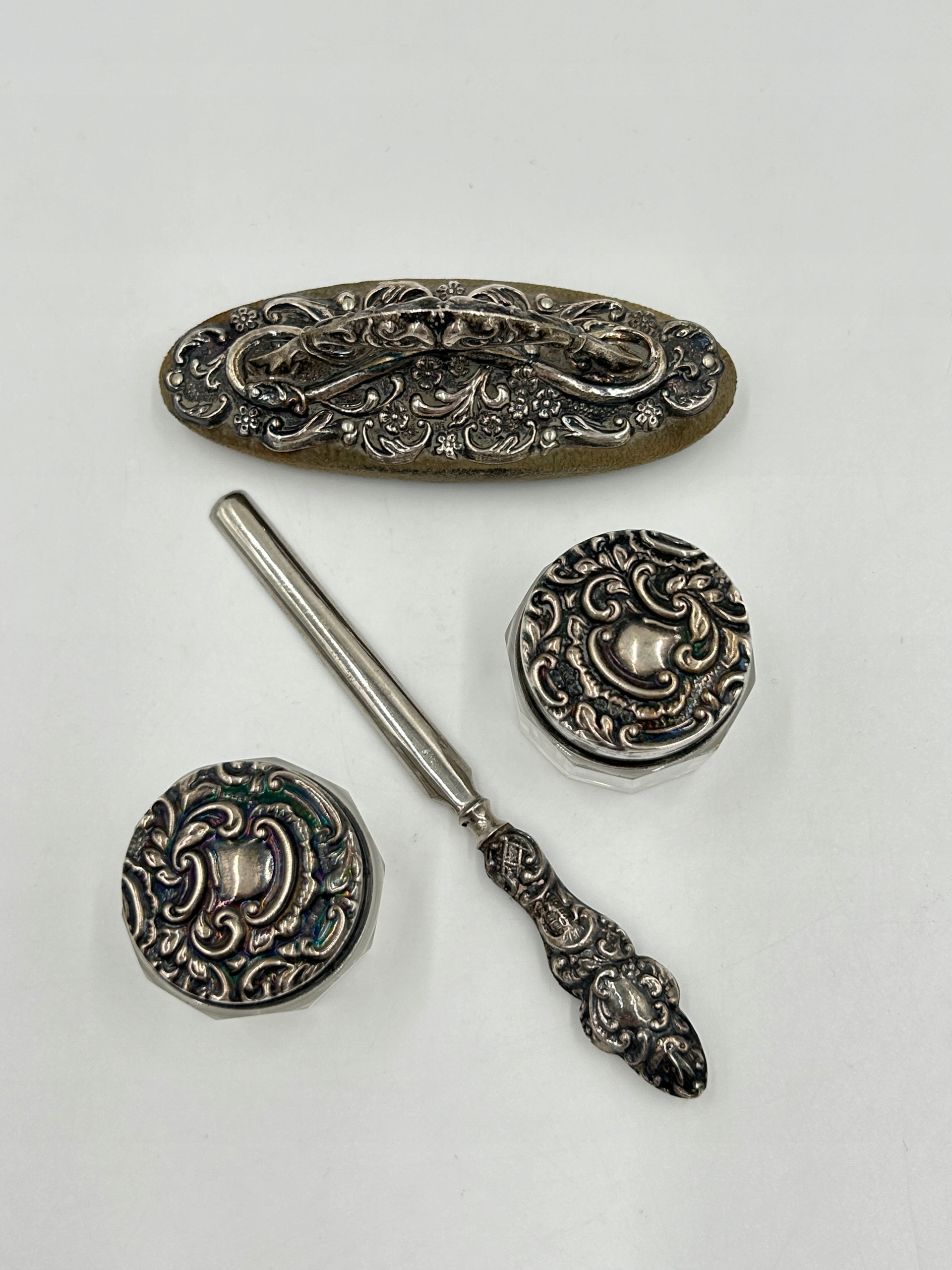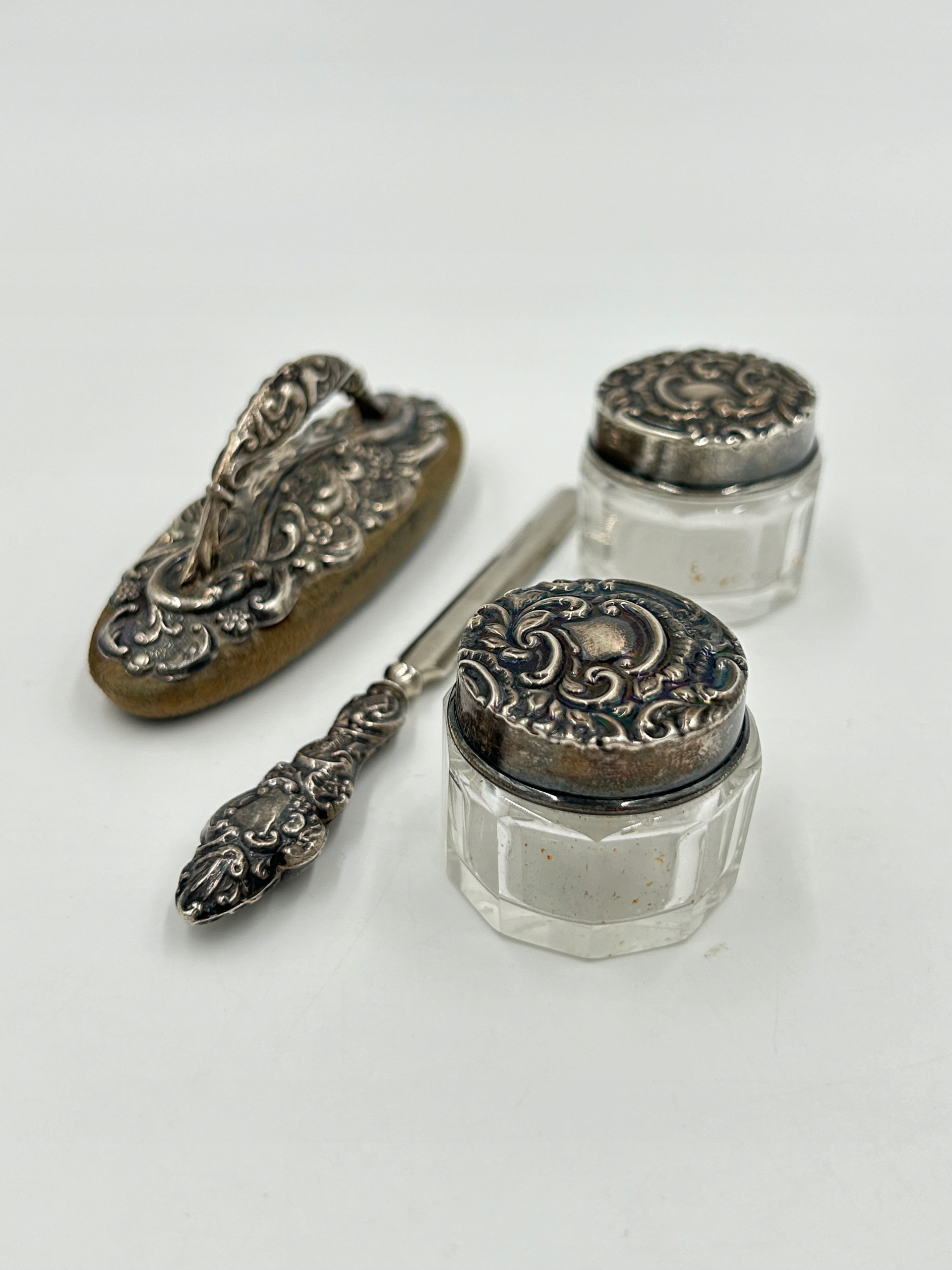 Представляю Вам элегантный набор декорированных туалетных принадлежностей, серебро. Оформление - рельефные растительные мотивы. Уникальный декоративный элемент для людей, которые ценят неподвластную времени элегантность. Античный. Честер, 1912 год.