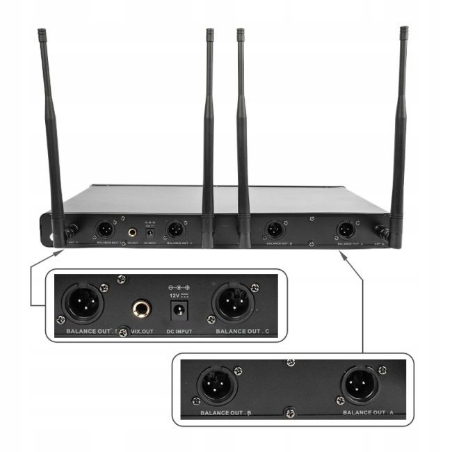 Волновой приемник UHF набора WMIC4 имеет 2 выходных канала XLR (A и B) и разъема 1/4 ". вмешательство