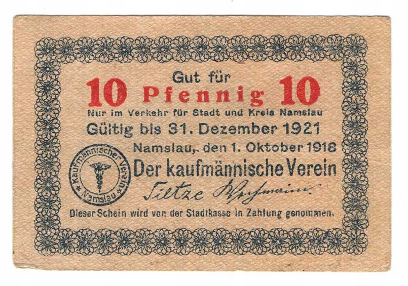 notgeld Namysłów Namslau 10 Pf 1918-21 stan 1 Kaufmanischer V odmiana