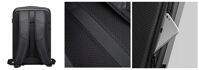 Рюкзак оснащен противокражным задним карманом на молнии с задней стороны и дополнительной ручкой для размещения рюкзака на ручке дорожной сумки.