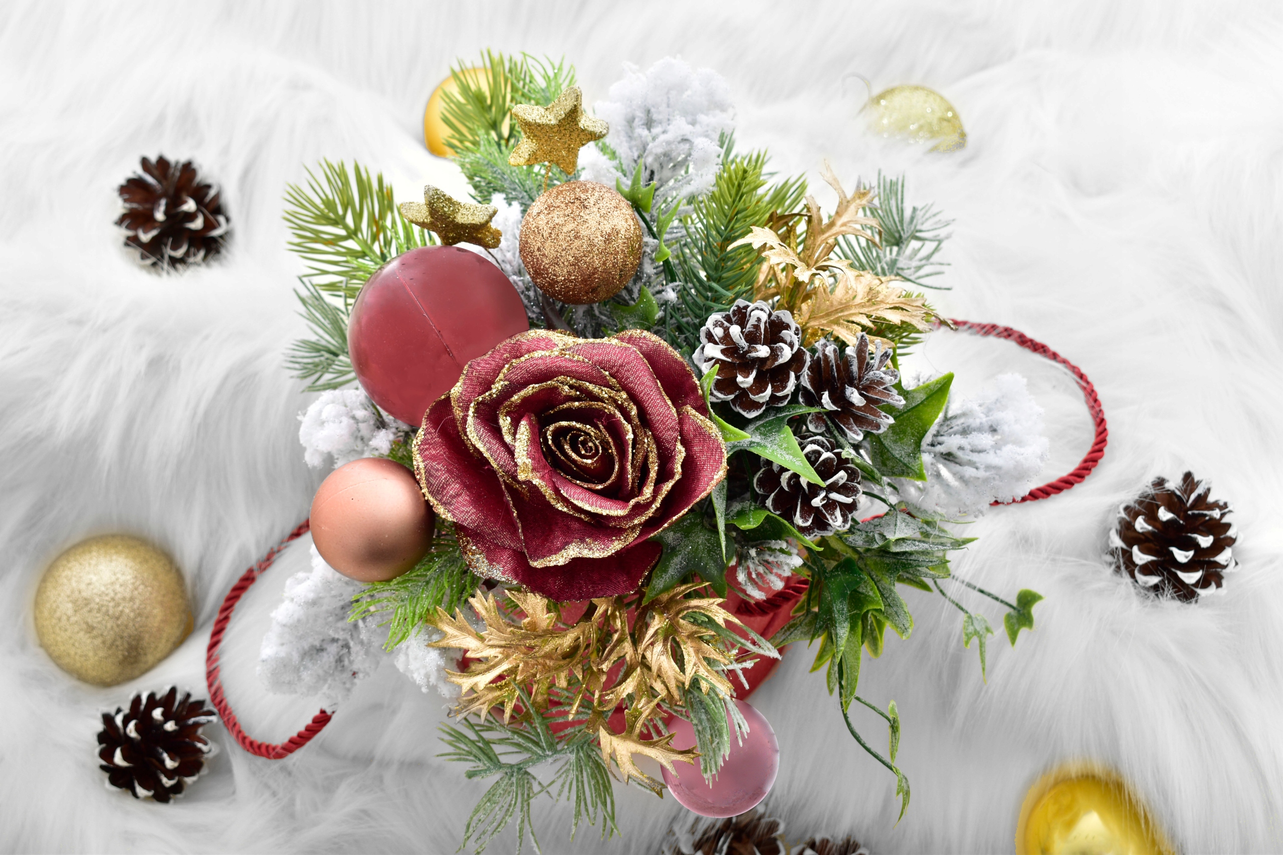 ✅ Внушительная роза чудесно контрастирует с зелеными листьями омелы, которые сверкают морозом.