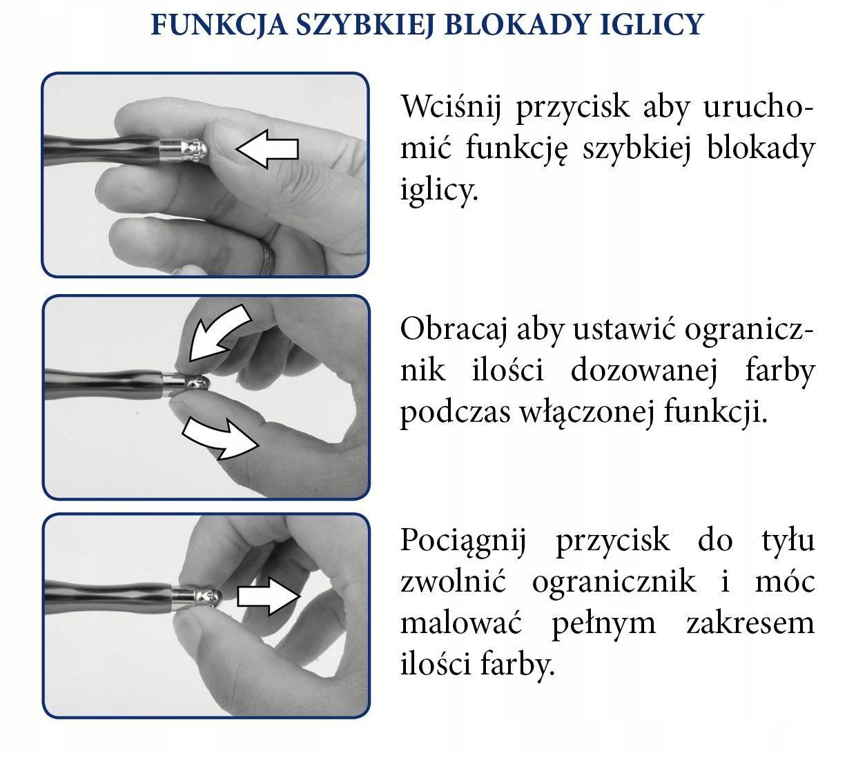 Аэрограф AirForce9001 оснащен инновационной системой быстрой фиксации иглы с помощью кнопки. После нажатия ограничитель хода иглы можно отрегулировать, повернув кнопку влево или вправо.