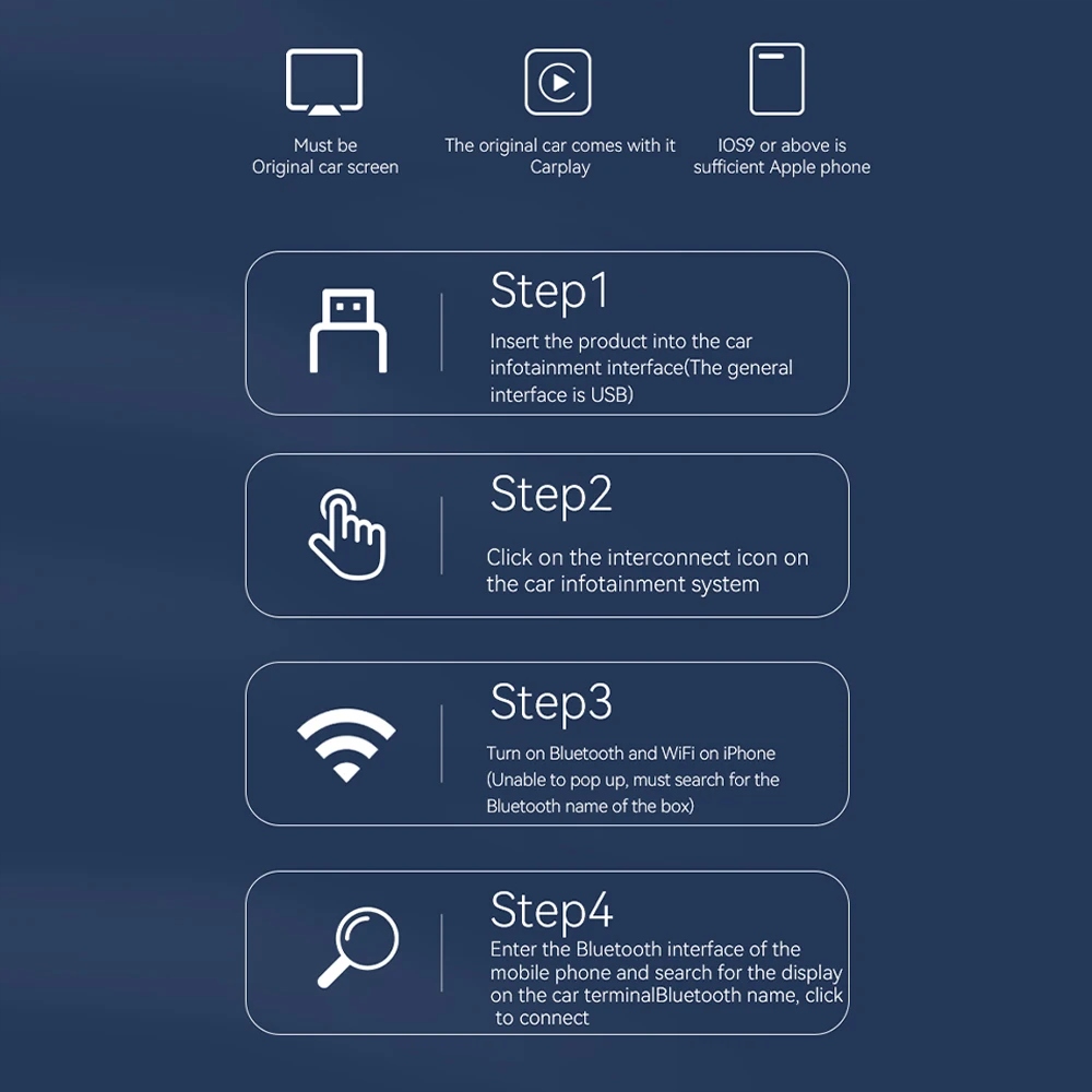 ⏺ Consive оригинальный CarPlay/Android CarPlay/Aiiroid Auto. Вставьте продукт в порт USB оригинального автомобиля, откройте iPhone Bluetooth, найдите название устройства, подключите Smart Box XXXX, согласен сочетать и выполнить продукт CarPlay продукта под подсказками и советами телефона.