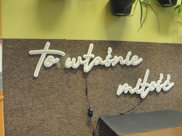 Надпись из неона LED FLEX. Неоновая вывеска размещается на белой ПВХ-карте, вырезанной в форме букв, в специально фрезерованных для этого пазах. Надпись состоит из двух частей, питающихся от отдельных источников питания. В комплект входят блоки питания и дополнительные диммеры. Просто подключите все к сети 230В. Очень хорош в качестве подарка. Его можно использовать как украшение комнаты. Их легко прикрепить к стене, повесить или поставить на стол.