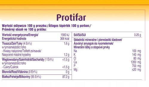 - Использование под наблюдением врача, не используйте у детей в возрасте до 3 лет, не используйте в случае непереносимости лактозы, аллергии на белки коровьего молока, галактосемию и фруктосемию. Из -за высокого содержания белка продукт не подходит для пациентов с почечной недостаточностью (без надлежащей заместительной почечной терапии) и печени, угрожающей энцефалопатией в печени. Продукт не может быть единственным источником пищи.