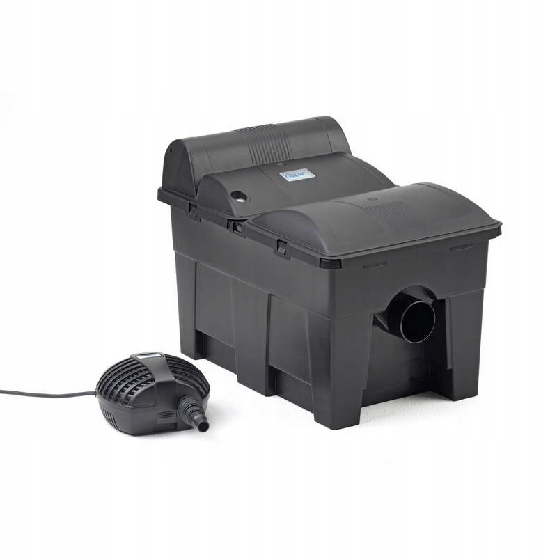 Важной частью комплекта является насос Oase FP-3500, который при энергопотреблении 70 Вт подает воду в фильтр с максимальной производительностью 3400 л/ч. Максимальный подъем водяного столба насоса — до 2,7 метра. Огромным преимуществом FP-3500 является керамическое рабочее колесо, которое не ржавеет, долговечно и может работать даже в соленой воде. Помпа также оснащена термовым выключателем, защищающим устройство от перегрева.