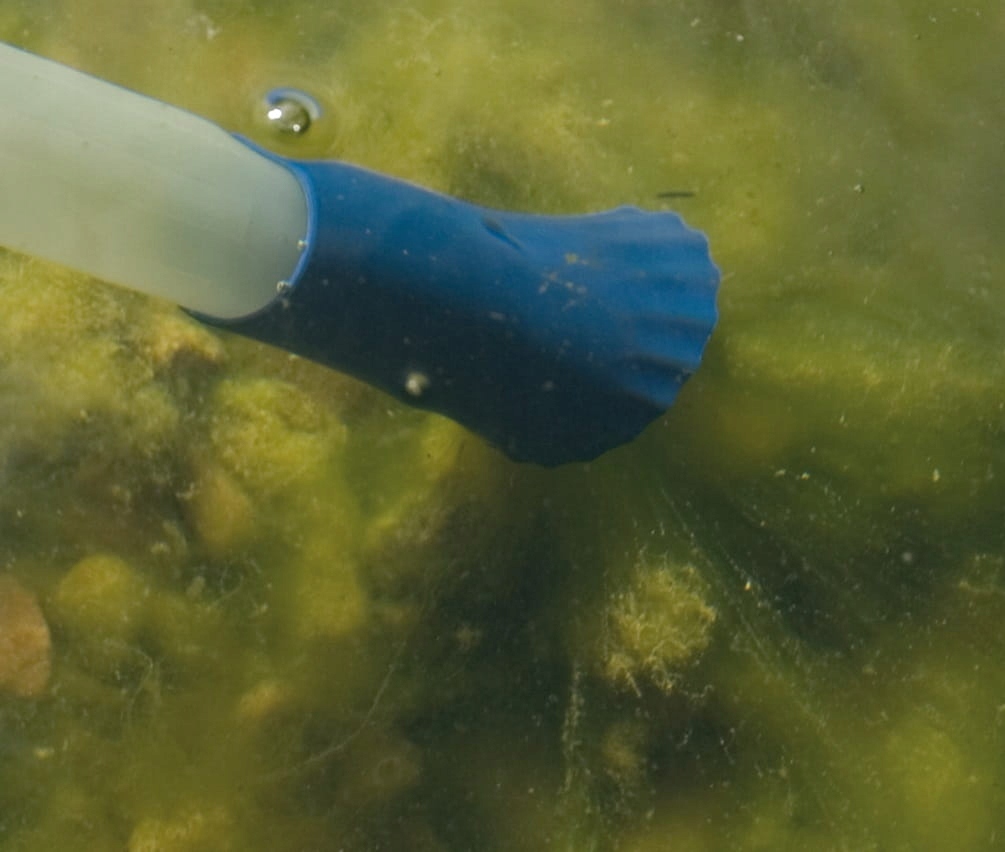 Большие молекулы, такие как камни или листья, останавливаются в резервуаре. Опора очень просто, используя молнию. Чтобы остановить меньшие молекулы> 1 мм, к выходу также был прикреплен дополнительный мешок для точного фильтра