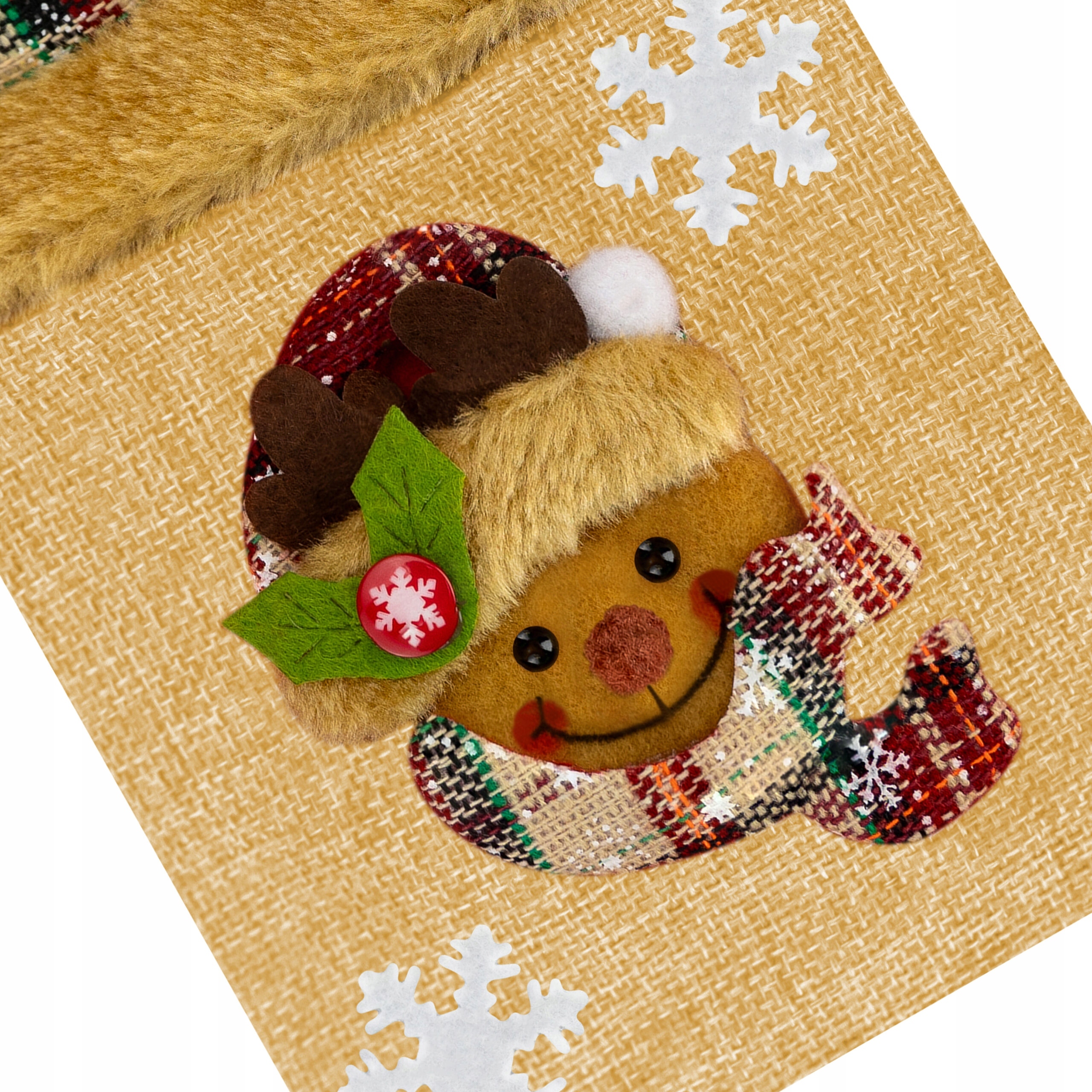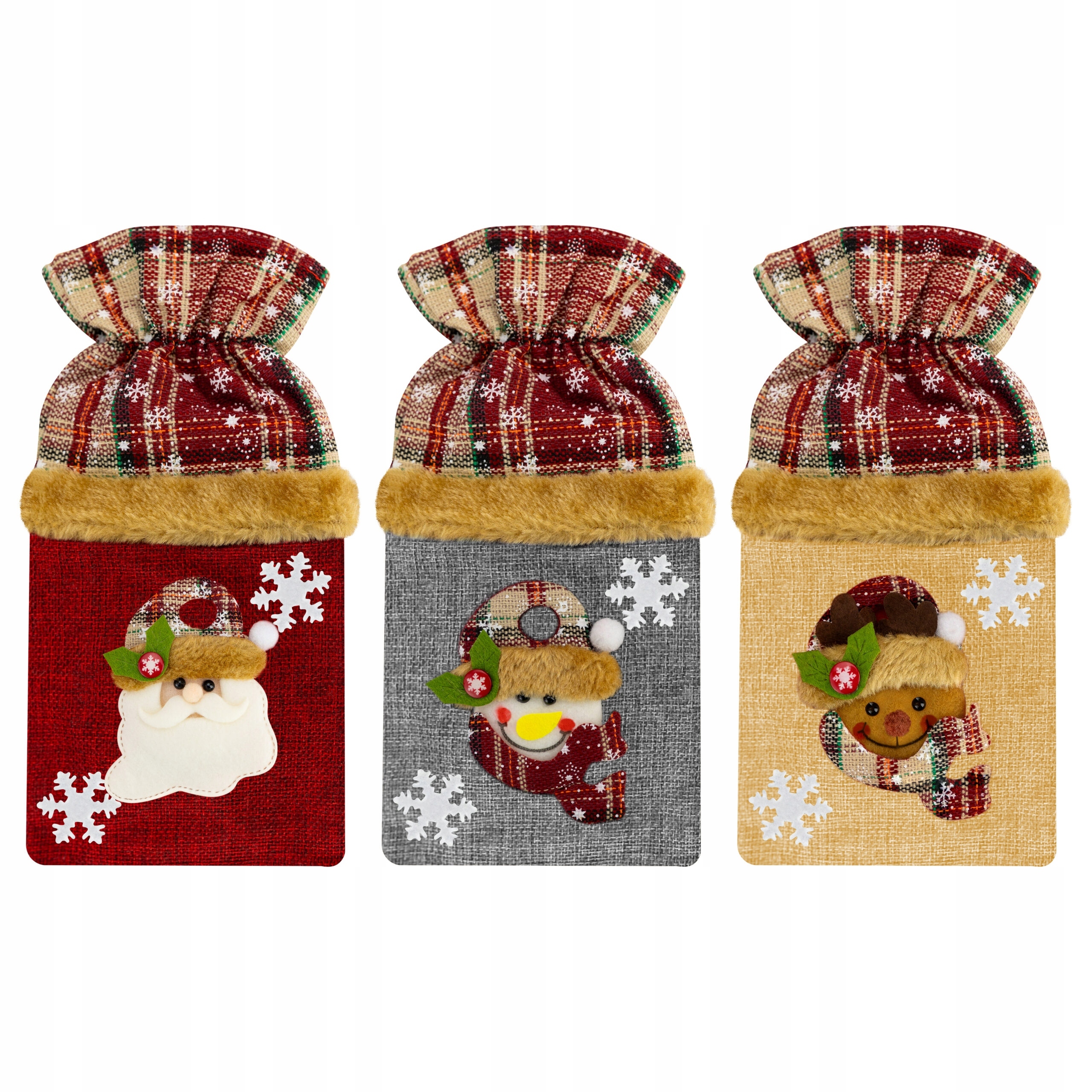 cover для бутылки - это элегантное декорирование рождественского стола, сделанное из прочных полиэфирных тканей. Он будет разместить бутылку с емкостью 750 мл или больше , с максимальным диаметром 7,5 см. Верхняя часть украшена материалом в снежинках, а дно украшено трехмерными персонажами оленей, Санты или Снеговика.