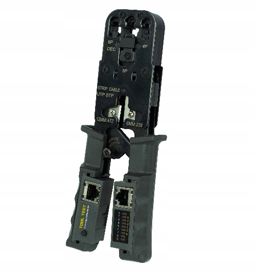 Инструмент имеет встроенный съёмник для изоляции и витую пару UTP/FTP. кабельный тестер с возможностью отсоединения от обжимного устройства.
