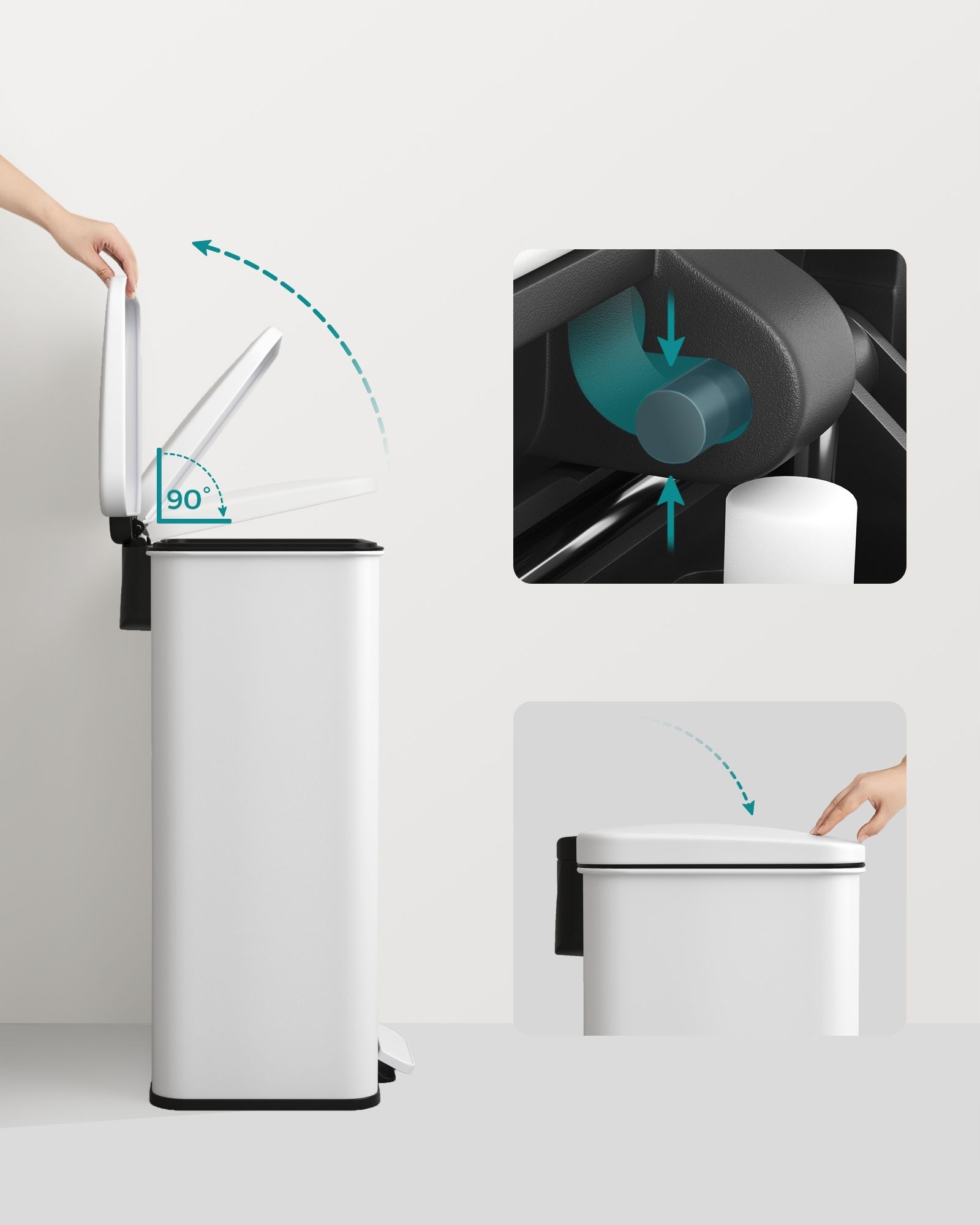 Современная емкостная корзина является необходимым решением для поддержки использования отходов, и благодаря хорошо разработанной крышке она закрывается медленно, тихо и осторожно, устраняя внезапное складывание во время использования. Крышка также предназначена таким образом, чтобы позволить открывать во время кухонных мероприятий, что облегчает доступ к корзине во время приготовления, при закрытии обложки выполняется простое движение рук, которое не требует больших усилий. Дополнительным преимуществом этой корзины является наличие зажима, которое удерживает мешок для мусора на месте, не давая его перемещению и поддержанию эстетического внешнего внешнего вида. Отсутствие внутренних ведер позволяет эффективно использовать пространство внутри корзины, что дает до 20% дополнительного места для отходов, эти функции делают мусорное ведро универсальное, легко чистить и создавать гигиеническую среду.