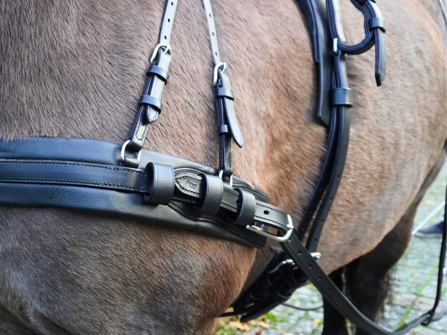 Черная кожа в сочетании с темно -коричневыми воронками создает контрастный, элегантный набор для глаз. Morgan Harness отлично смотрится во время шоу, парадов и как hupply Harm к карете.