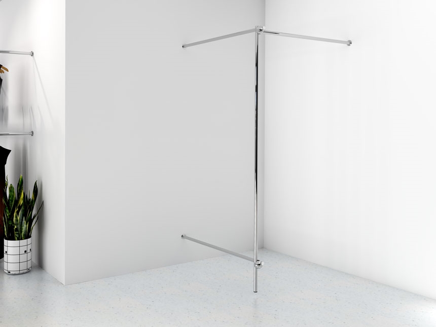 Одноугловая примерочная, изготовленная из стальной хромированной трубы диаметром 25 мм, с хромированными соединительными элементами и черными пластиковыми ножками. Дополнительная нижняя планка позволяет установить бортик из мебельного щита и стабилизирует примерочную.