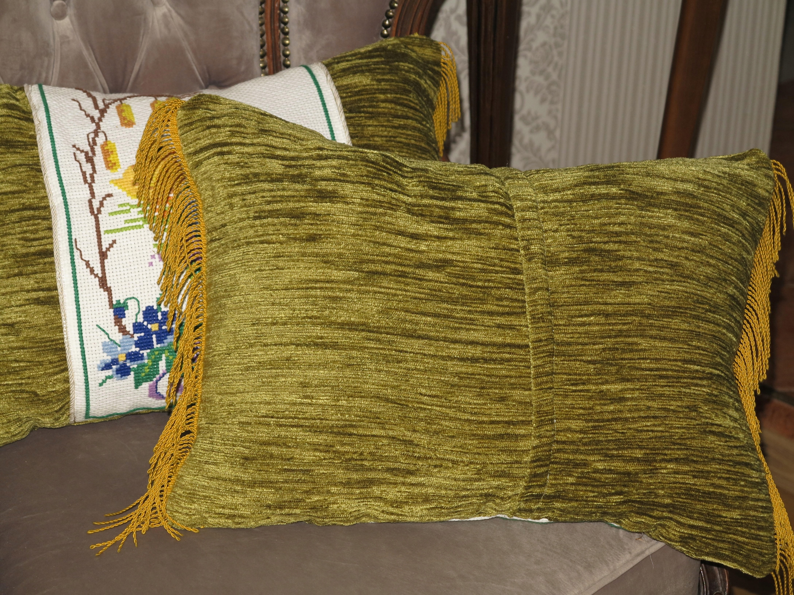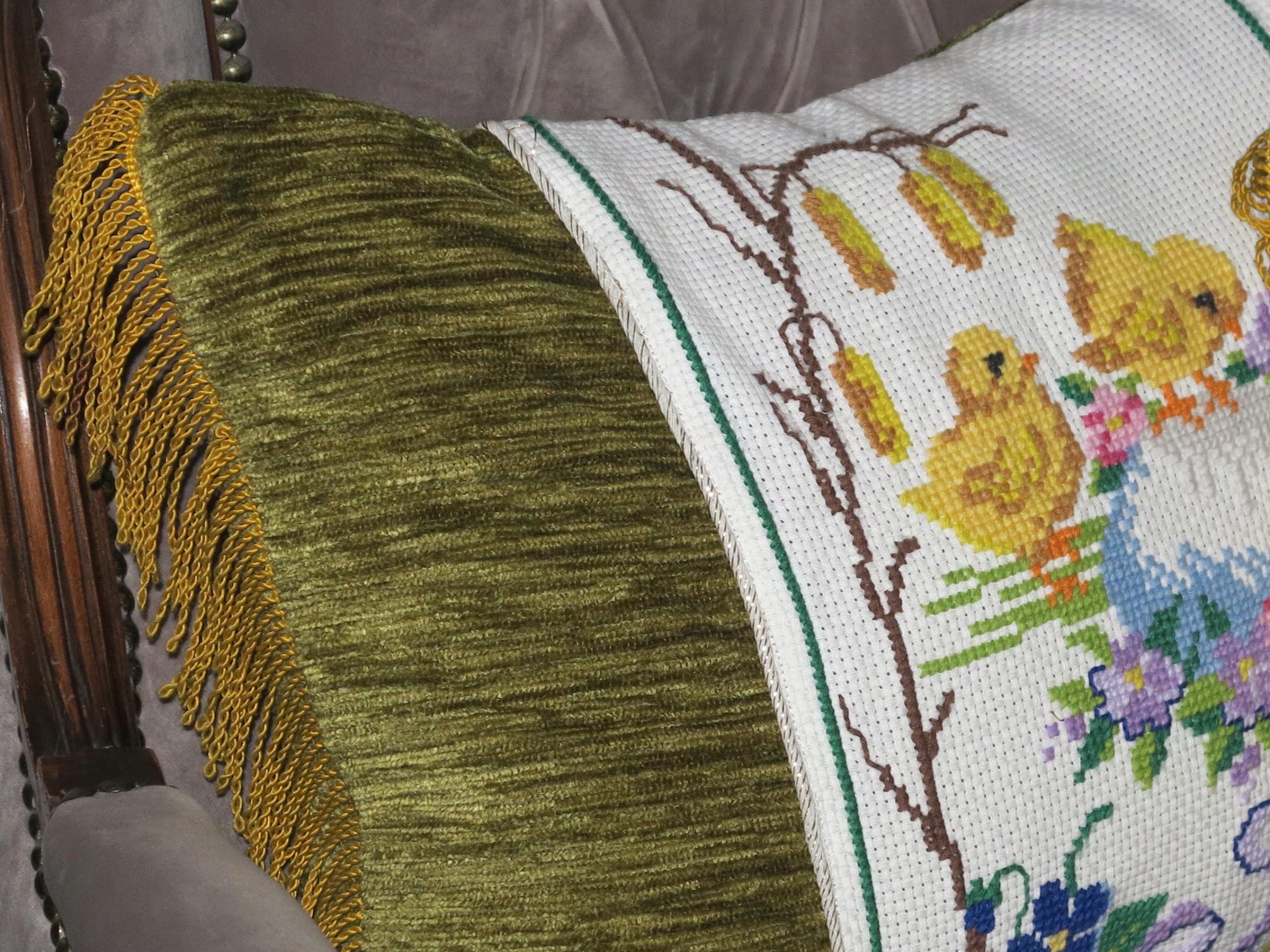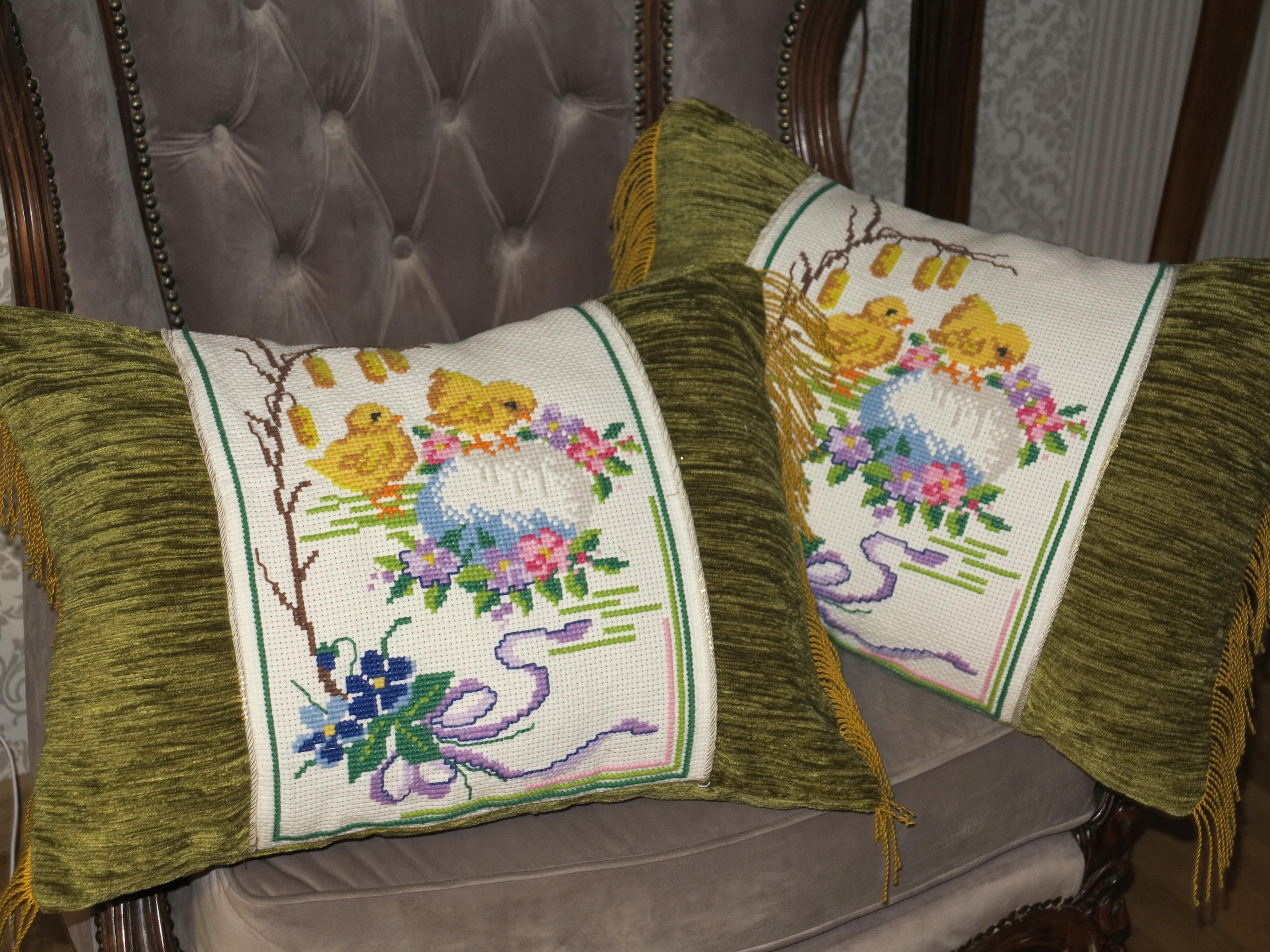 очаровательные и чрезвычайно декоративные бархатные подушки. Фронт украшен ручной замысловатой пасхальной поперечной вышивкой. Подуски с позорной зеленью. Стороны украшены золотыми полосами