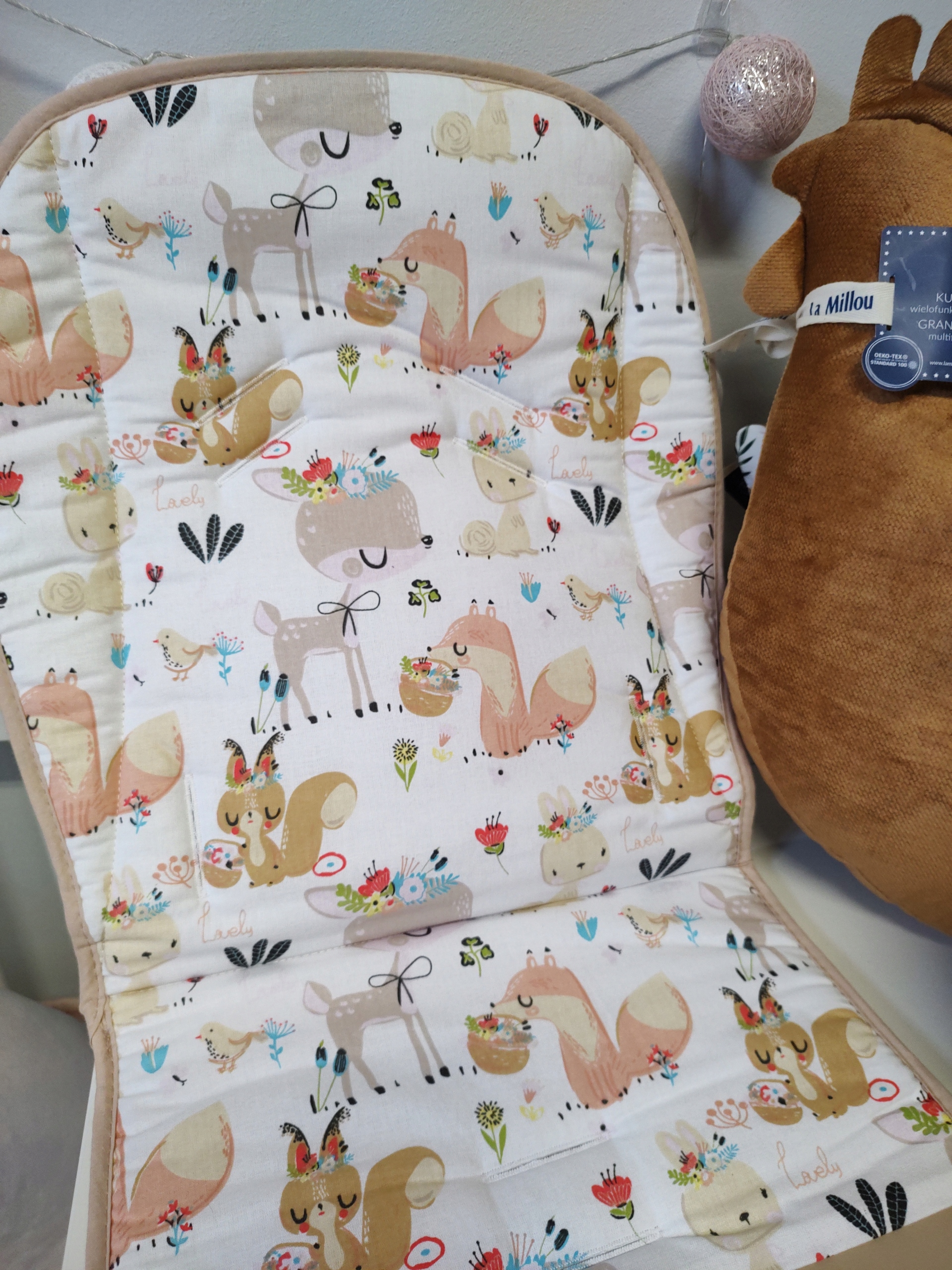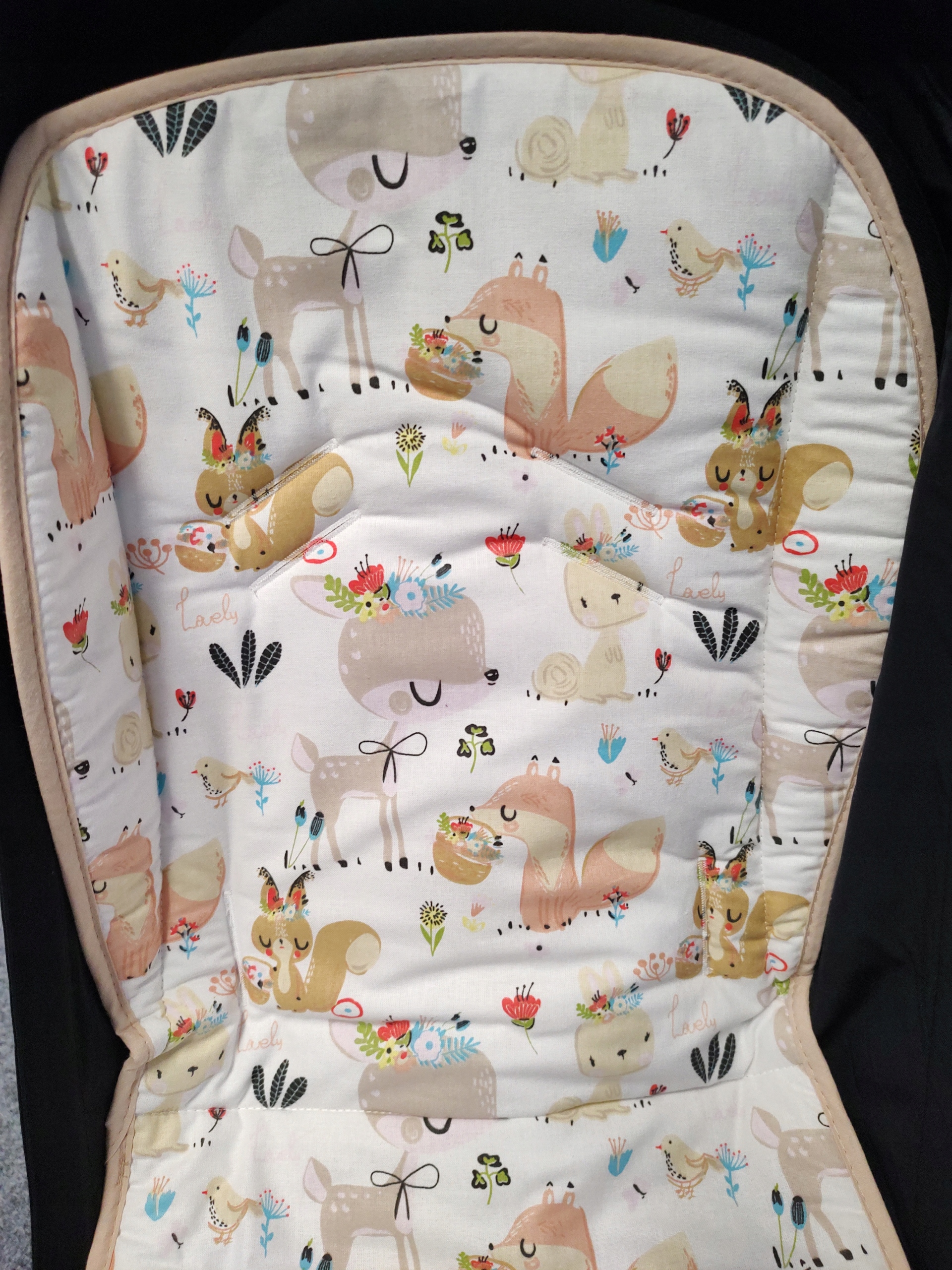 - Универсальное расположение прорезей для ремня, позволяющее легко подогнать вставку под различные типы колясок