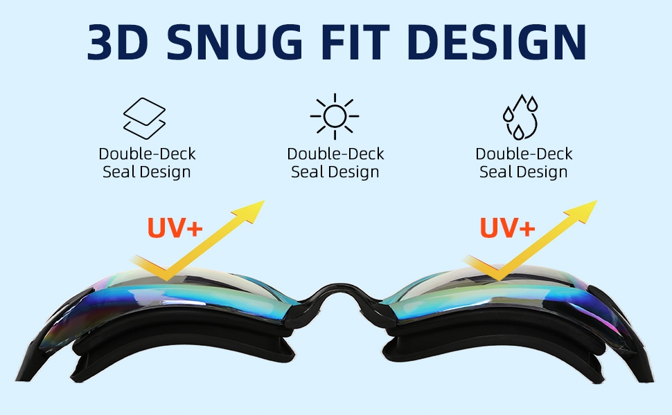 Линзы плавательных очков покрыты ультрафиолетными поглотителями, которые могут максимально поглощать ультрафиолетовые лучи с высоким содержанием энергии, плавательные очки не только защищают глаза от ультрафиолетовых лучей, но и избегать плохого опыта, вызванного отражением солнца.