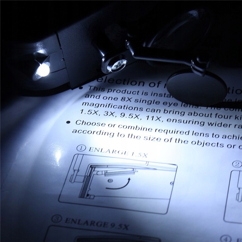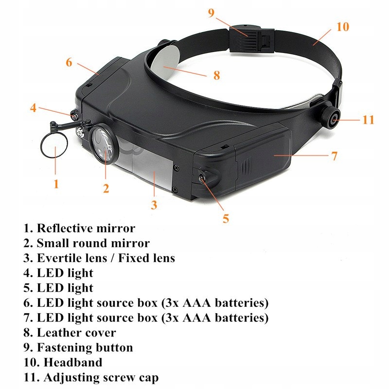 Профессиональная наголовная лупа с различными линзами и увеличением 1,5x; 3 раза; 9,5х; 11x — идеальное устройство для повседневного использования. Может использоваться ювелирами, нумизматами, специалистами по обслуживанию электроники, часовщиками и т. д.