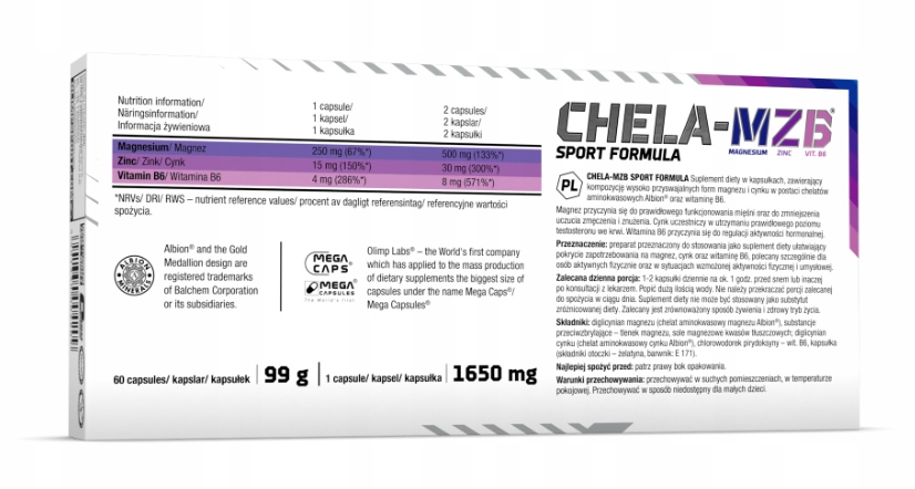 chela mzb Sport Formula Mega Caps - безопасная пищевая добавка, в частности для спортсменов, как отдыха, так и профессионалов, которые хотят позаботиться о своих мышцах (магния), поддерживают баланс электролита (магний) , поддерживайте адекватный уровень тестостерона в крови (цинк) или уменьшите ощущение усталости (магний, витамин B6)