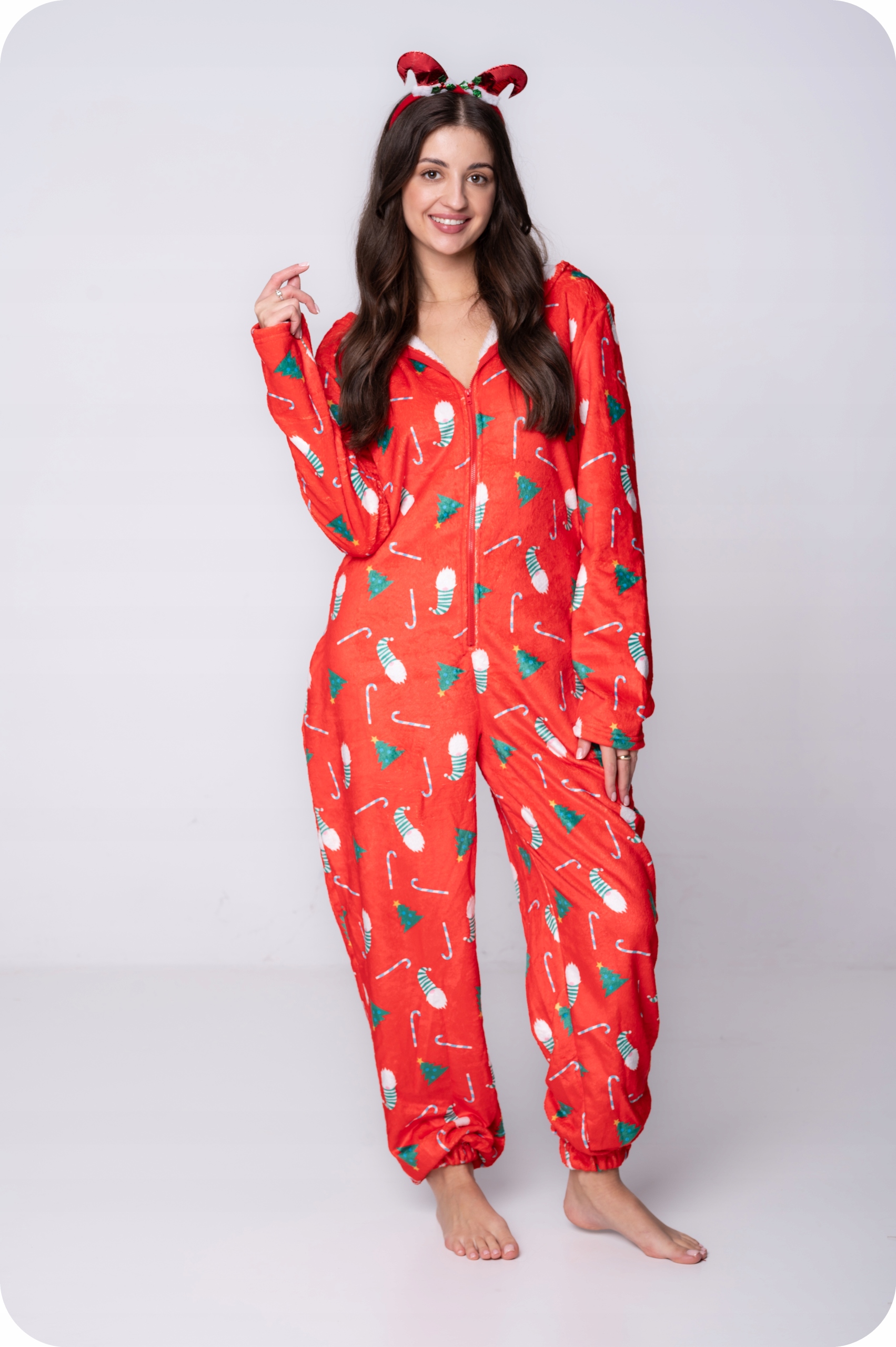 Комбинезон-пижама кигуруми для взрослых ONESIE — красный с елочками ⭐⭐⭐⭐⭐