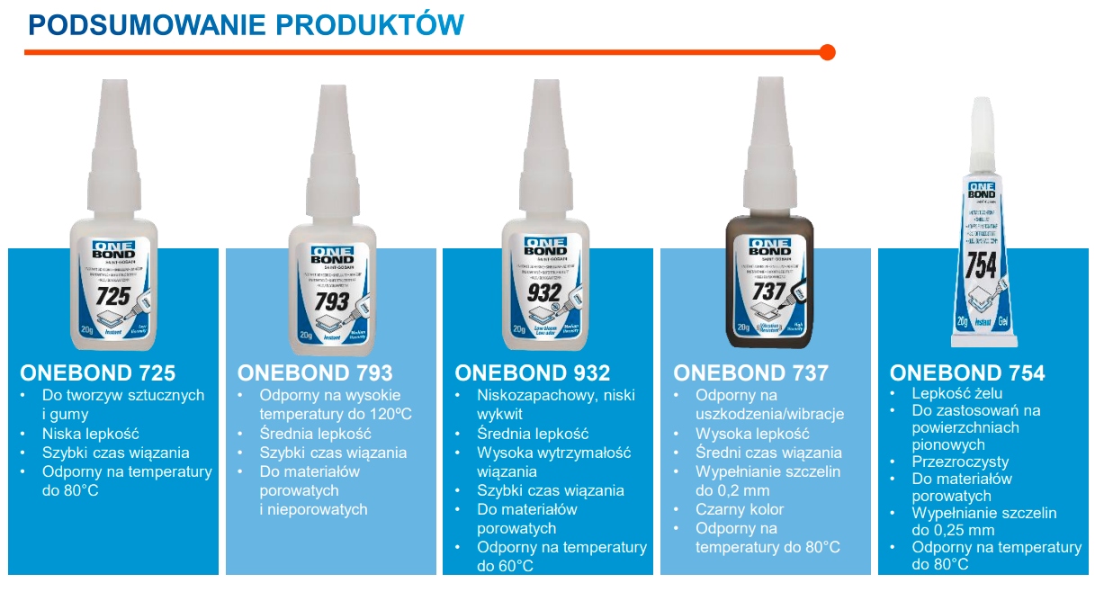 В промышленности наиболее часто используемыми цианоакрилатами являются этилцианоакрилаты (ЭЦА). В линейку OneBond входит один ECA: OneBond 725, предназначенный для склеивания пластиков и резин. Поскольку стандартные клеи ECA представляют собой жидкости с низкой вязкостью, они не подходят для нанесения на вертикальные поверхности. Поэтому был разработан высоковязкий ЭКА, то есть гель, дополнив состав загустителями, такими как растворимые акриловые полимеры или гидрофобный коллоидный кремнезем. OneBond 754 — это клей ЭКА в форме геля — нерастекающийся моментальный клей, предназначенный для склеивания пластмасс и резины, а также пористых материалов, таких как дерево, бумага, кожа и ткань.