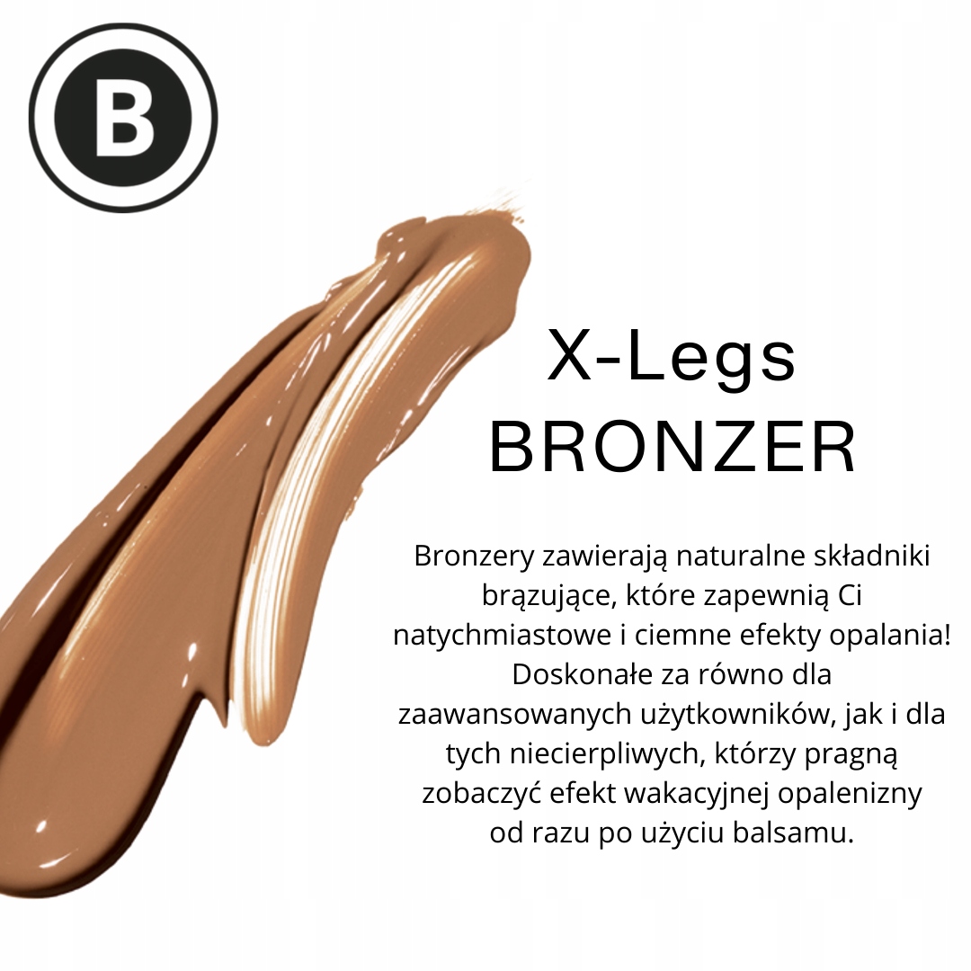Сделайте свои ноги потрясающими с помощью X-Legs Bronzer! Бронирующая формула X-Legs специально затемняет участки тела, трудно поддающиеся загару. Содержит большую дозу натуральных и косметических бронзаторов - DHA, карамель и эритрулоза, обеспечивающих мгновенный глубокий загар благодаря насыщенной и сильно затемняющей формуле.