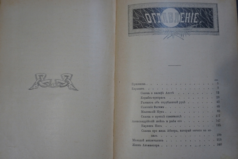 Подсказка. Караван. История аиста-калифа. Корабль-призрак. История отрубленной руки. Спасение Фатимы. Маленький Мук. История ложного принца. Шейх Александрии и его слуги. Маленький Длинноносый. История еврея Авенира, который ничего не видел. Молодой англичанин. Жизнь Аллмансора. Таверна в Шпесарте. Золотая легенда. Холодное сердце. Приключения Саида. Пещера Стинфолл. На обороте форзаца 1Б хозяйская надпись: «Собственность кадета Николая Кожуховского».