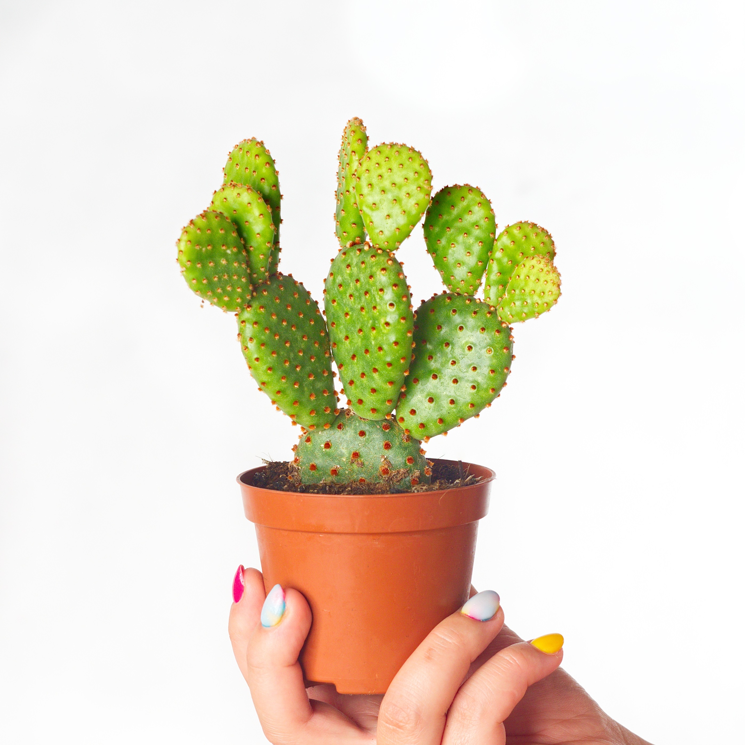 Opuntia microdasys, обычно называемая «кроличьими ушками», происходит из северной Мексики и пустынных регионов, простирающихся до Аризоны. В местных условиях он может достигать до одного метра в высоту и 2 метров в ширину. Колючая опунция напоминает сегменты, покрытые пучками волосков, называемых глохидами. Они выглядят как вата, но на самом деле представляют собой многочисленные мелкие колючки, обращаться с которыми всегда следует в перчатках. Если летом обеспечить полное солнце и более низкую температуру зимой, опунция также будет радовать глаз красивыми желтыми цветками.