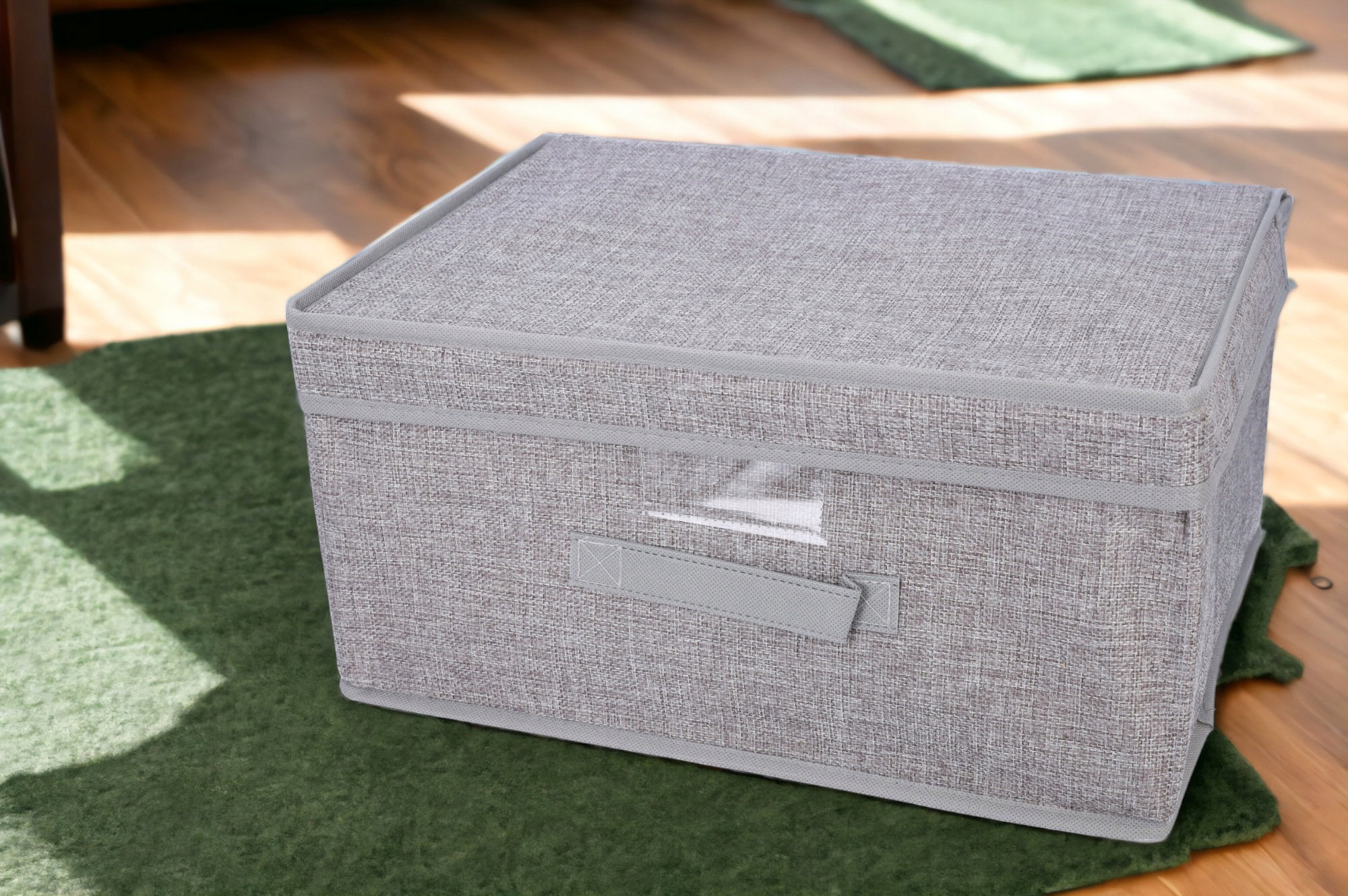 Функциональное ящик для хранения b> из толстого полиэфирного льна. Идеально организовать пространство в гардеробе, гардеробе, полке или на полке. Светло -серый цвет и эстетическая отделка заставляют организатор хорошо смешиваться с современным интерьером.