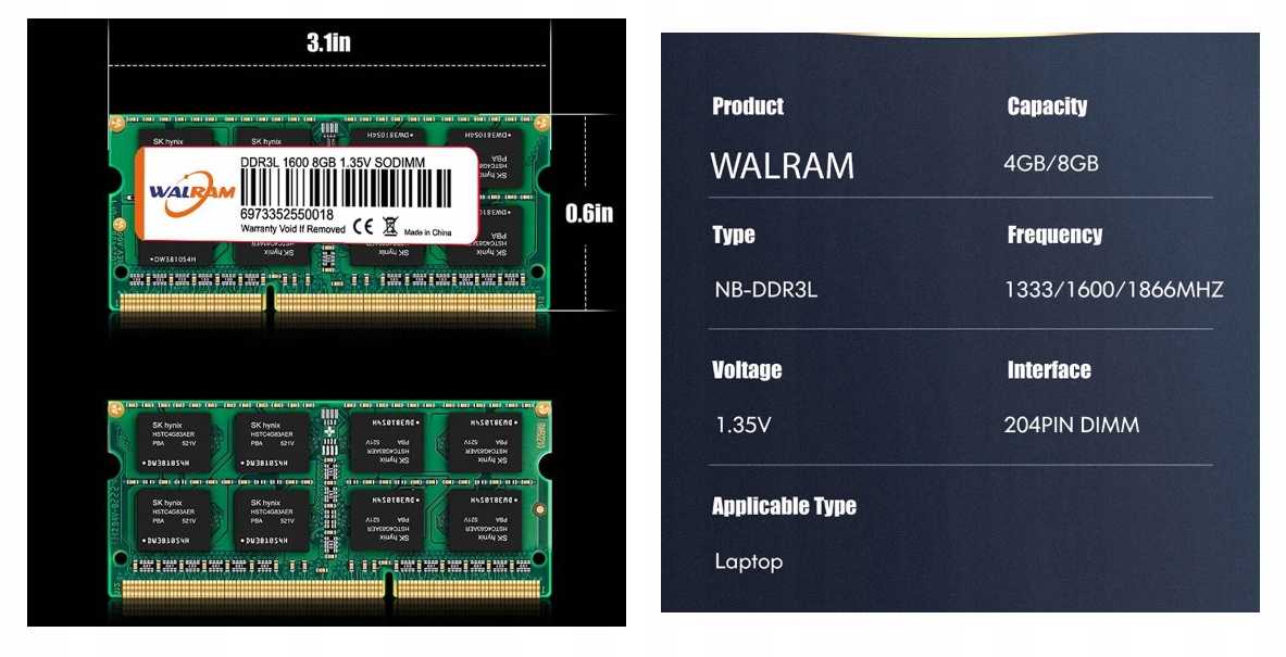 ddr3l: (1). PC3L-12800/PC3-12800 204-PIN НЕ ПРОИЗНЕННЫЙ НЕПОЛИНСКИЙ СТАНДАРТ CL11 JE 1,35 В