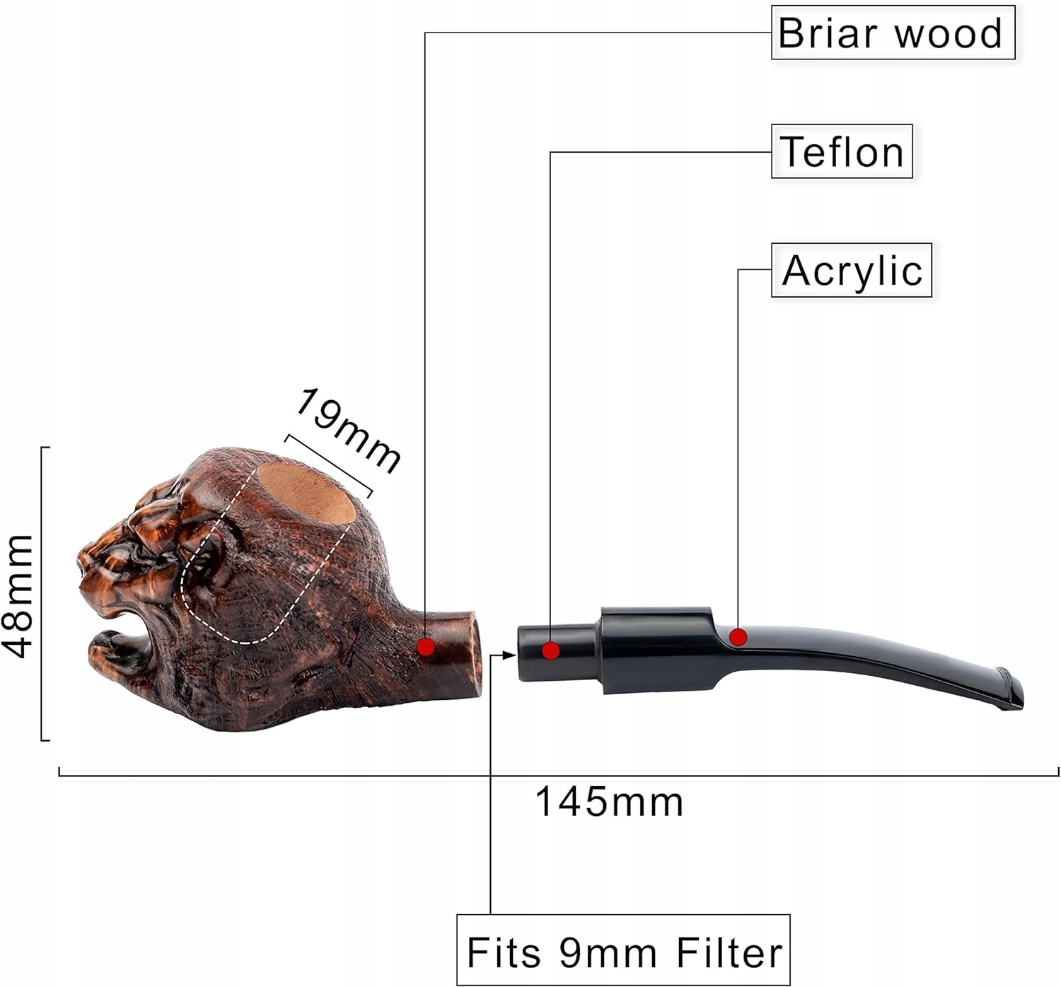ИЗГОТОВЛЕНО ВРУЧНУЮ РАБОТУ: резная курительная трубка из бриара для повседневного использования. Входит в нашу коллекционную серию. Отличный подарок любому курильщику трубки. РАЗМЕРЫ: Общая длина: 14,5 см / Высота камеры: 4,8 см / Глубина камеры: 2,9 см / Внутренний диаметр камеры: 1,9 см / Фильтр: 9 мм (не входит в комплект). МАТЕРИАЛЫ: Чаша вырезана из итальянского бриара; Стержень имеет акриловый мундштук и тефлоновый патрубок. Кольцо металлическое. Трубка полируется высококачественным воском. В НАБОРЕ: трубка для табака + футляр/коробка. Сделано в Европе