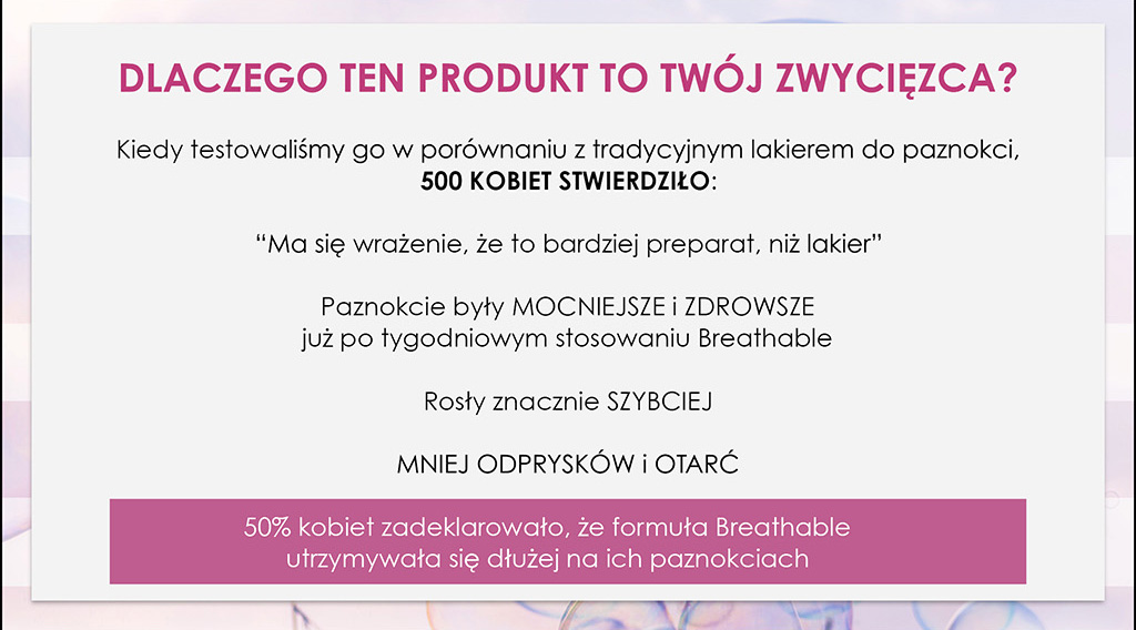 Первое профессиональное универсальное средство, сочетающее подготовку и окраску. В отличие от традиционного лака для ногтей, Breathable благодаря формуле Advanced Oxygen Technology создает на ногтях проницаемый слой, позволяющий кислороду и воде проникать через ногтевую пластину к ногтевому ложу. Передовая технология в сочетании со смесью арганового масла, провитамина В5 и витамина С интенсивно увлажняет, регенерирует поврежденные ногти и стимулирует их здоровый рост. В состав продукта входят ингредиенты, отвечающие за адгезию и блеск, поэтому вам не придется использовать базу и топ.