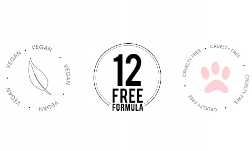 Формула 12 FREE не содержит: DBP (дибутилфталат), тулен, формальдегид, камфора, MEHQ, формальдегидная смола, парабены, глютен, ингредиенты животного происхождения, этилтозиламид, ксилол и MIT (метилизотиазолинон).