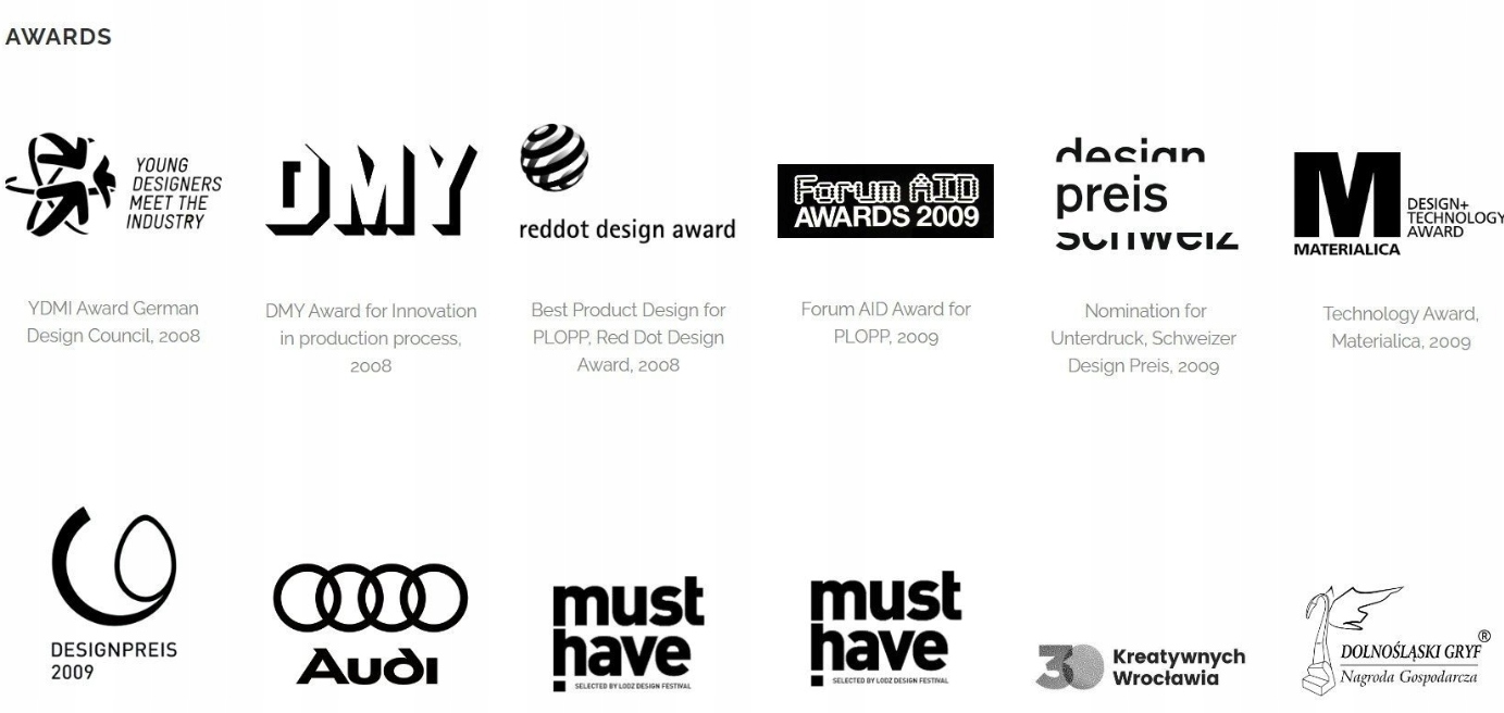 Один из самых выдающихся и признанных в мире польских дизайнеров. Технолог и изобретатель, создатель FIDU - инновационная техника пространственного моделирования металлов с помощью сжатого воздуха или воды. Он использует его при разработке эффективной мебели и другой внутренней мебели, а также скульптуры с крупными форматами, в том числе: Нава - Остров Далиова, Остров Тумски, Вроцлав, Вир - Галерия Норт, Варшав. Стул Plopp, разработанный им, 2008 год, находится в постоянной коллекции Pompidou Centrum в Париже как один из двенадцати стульев, которые произвели революцию в современном дизайне. Red Dot Design Award, 2008; Хороший шаблон, 2009; Награда за дизайн материи, 2009 г.; Немецкая премия Совета по дизайну, 2009 г.; Audi Mentor Prize от A & W, 2011. Прогноз, Biennale Internationale Design Saint -Etienne, Saint -Etienne, France, 2010; Blow and Roll, Музей Vitoria & Albert, Лондонский дизайн -фестиваль, Лондон, Великобритания, 2010; Будущие кочевые, DMY International Festival of Design в Берлине, Берлин, Германия, 2013; Парижская неделя дизайна, Париж, Франция, 2014; Милан дизайн Неделя, Милан, Италия, 2014, 2015, 2016; Польские дизайнеры Польского дизайнеров, Музей города Гдинии, Гдыния, 2017; Международные интерьеры показывают Imm Cologne, Колония, Германия, 2018; 10 лет Ploppa, Domoteka, Warsaw, 2018; Fuorisalone, Galleria Rossana Orlandi, Milan, Italy, 2018. Музей Für Gestaltung Zürich (Музей дизайна), Цюрих, Швейцария; Музей дизайна Vitra, Weil Am Rhein, Германия; Музей современного искусства (Музей современного искусства) Мома, Нью -Йорк, США; Pinakothek der Moderne, Мюнхен, Германия.