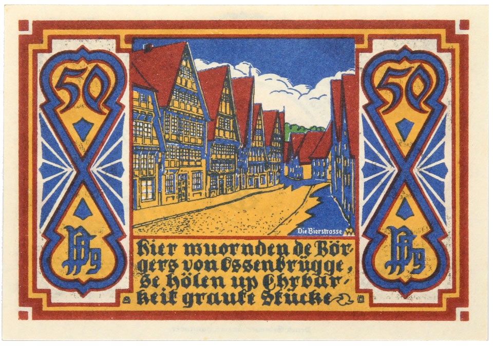 osnabruck - банкнота - 50 Pfennig 1921 - Die Bierstrasse - Stan UNC! Образец номер и буквы серии. Оригинал!