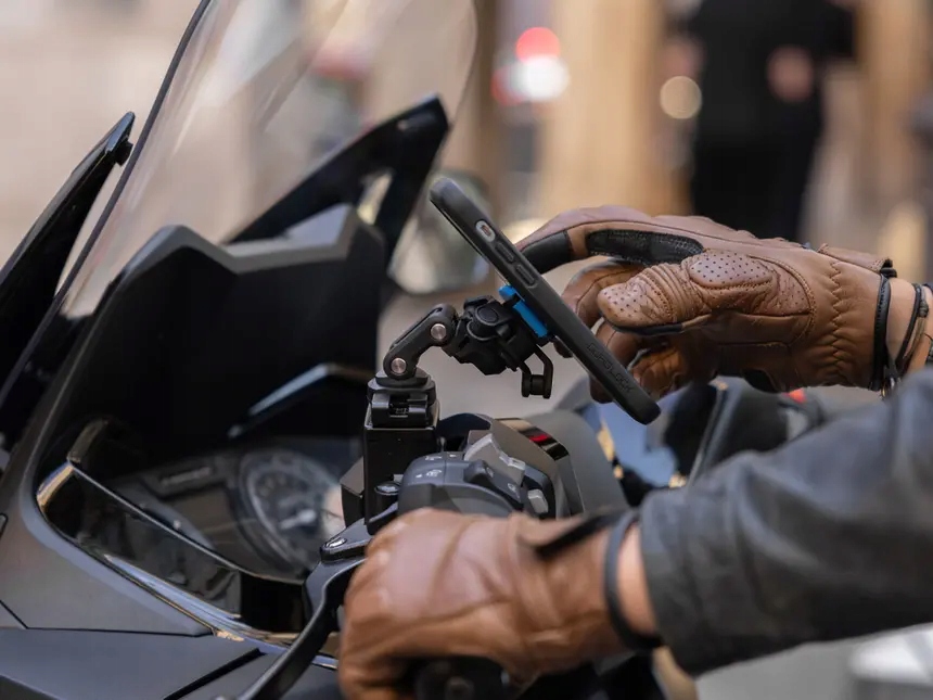 Регулировка расстояния между отверстиями возможна в диапазоне от 38 мм до 70 мм (от 1 1/2 "до 2 3/4"). Ручка может быть перемещена вбок, когда она установлена на небольшом покрытии тормозных резервуаров, гарантируя, что телефон будет в положении, обеспечивающем полный доступ ко всем элементам управления мотоциклом.
