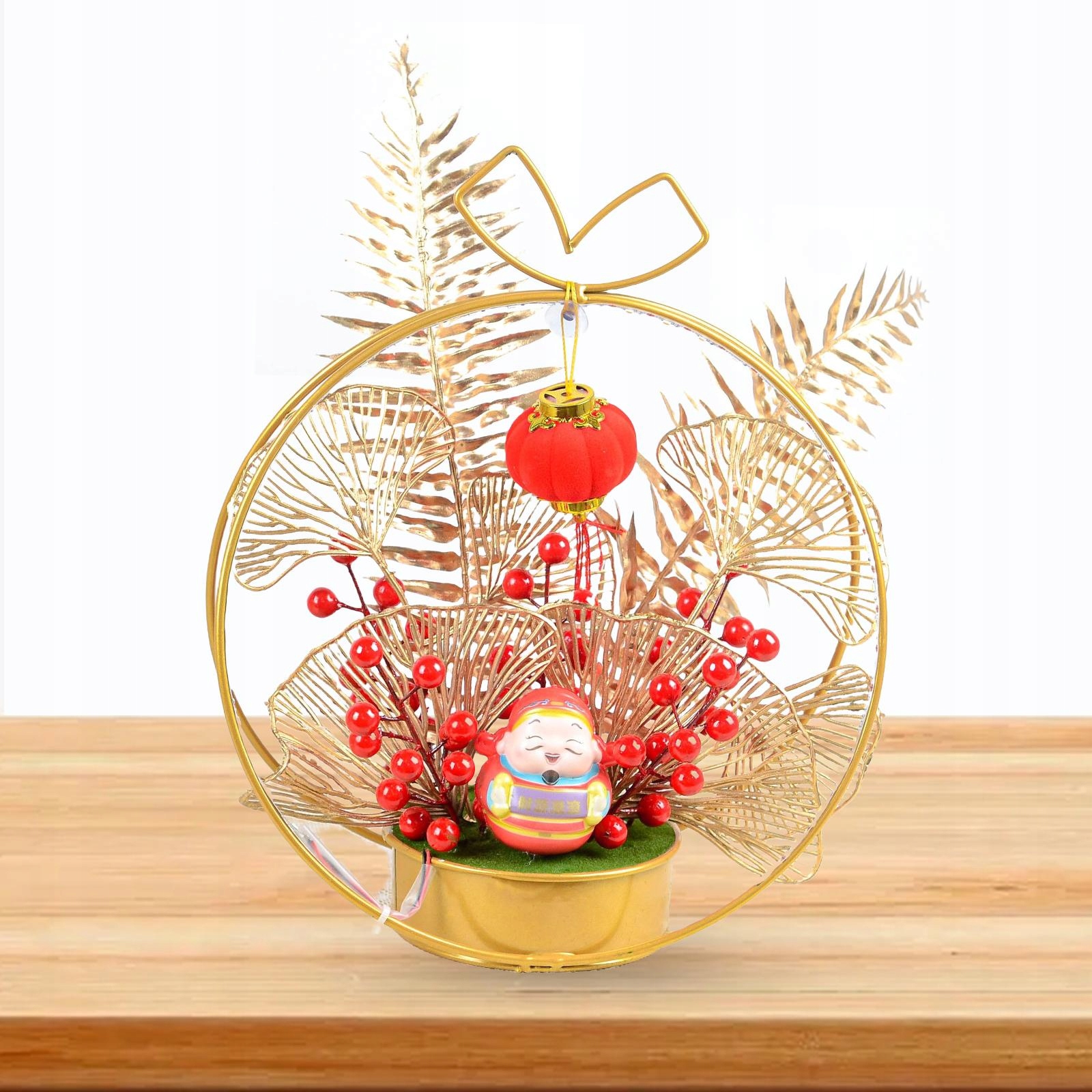 Bonsai от весеннего фестиваля: красные искусственные филиалы бонсай ягоды украшения китайского новогоднего декора с статуями кукол, добавляя праздничную атмосферу.