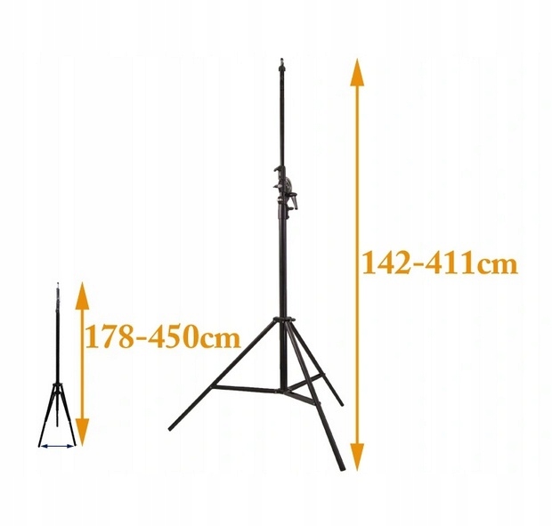 - Высота штатива в рабочем положении: 142–411 см.