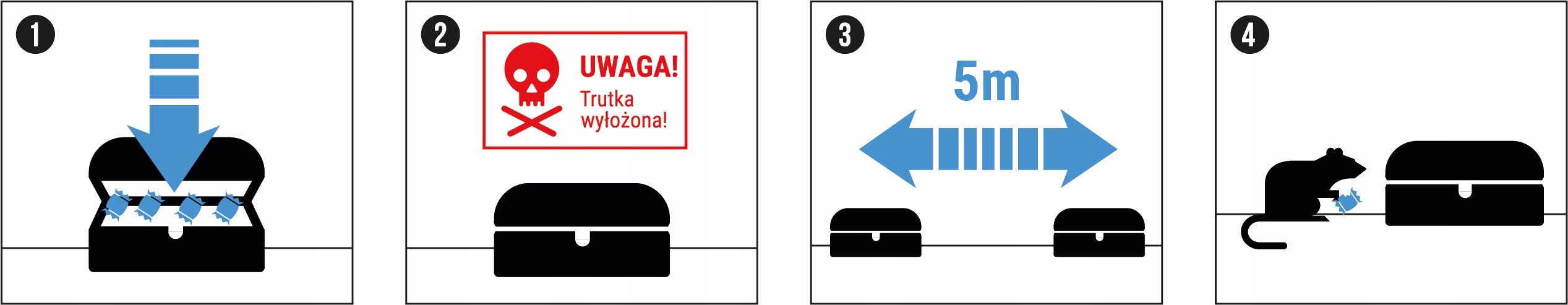 Станции с родентицидами следует размещать в недоступном для детей и домашних животных месте. >. Также следует помнить, что станции должны защищать приманку от неблагоприятных погодных условий. Минимальное расстояние между станциями должно составлять 5 м.