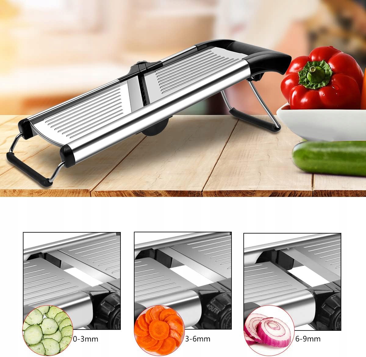 - 🥔 - 【Высокое качество】: мы фокусируемся на выборе прочного из нержавеющей стали и высококачественного пластика, чтобы обеспечить прочный, регулируемый растительный слайлер. Отличный подарок для любителей кулинарии и поваров любителей.