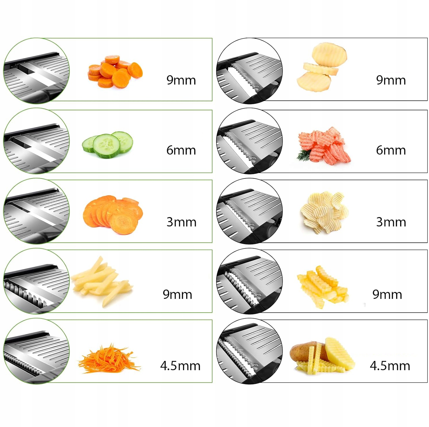 - 🥔 - 【Регулируемый овощный слайсер】: благодаря конструкции ручки лезвия V может быть установлен на пять различных толщин резки в зависимости от ваших потребностей. Это означает, что овощи могут быть нарезаны на равные срезы 3 мм, 6 мм и 9 мм толщиной и Жульен с толщиной 4,5 мм и 9 мм. Защитите руки от острых ножей. Несоотрабные резиновые ножки овощного слайсера также обеспечивают безопасную работу.
