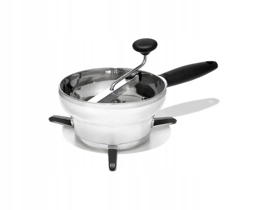 Чаша имеет 3 складные ножки, которые позволяют помещать пюре прямо в миску или кастрюлю (максимальный диаметр 28 см).