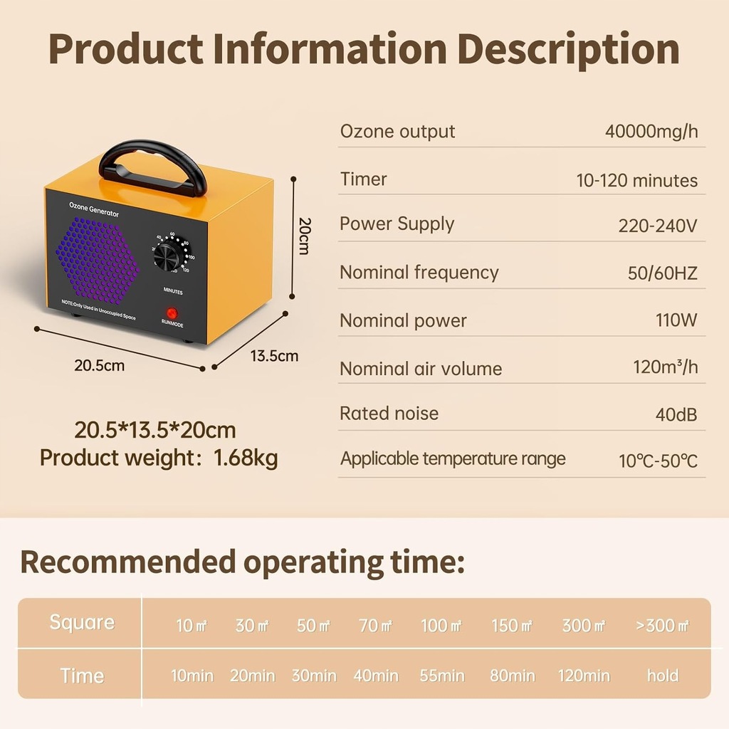 очиститель воздуха может производить 400 000 мг озона каждый час, область очистки составляет до 300 м². Он сразу же производит массивный озон, быстро удаляет такие ароматы, как запах дыма, запах домашних животных, запах подвала, плесень, запахи предыдущего арендатора и другие летучие органические соединения, такие как формальдегид, помогает в удалении и задержке развития плесени, уменьшает аллергены и создает приятную среду с чистым воздухом. 4-слойная керамическая озоновая пластина, мощность озона 10000 мг на слой озоновой пластины. Это очень эффективно, истощает тепло, потребляет меньше энергии (экологически чистое) и более устойчив к влаге. Окружающая среда (более длительная жизнь).