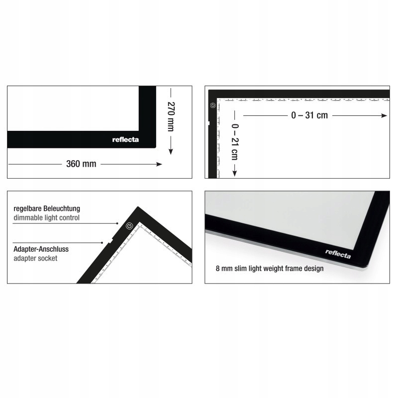 Освещающая панель с современной светодиодной технологией Superslim, осветительная поверхность 21x31 см со шкалой в см на краю поверхности, гладкий контроль мощности, контроль сенсорного управления, переменный/постоянный товар/8 Вт переменного тока/ток - 3,5 мм разъем, светодиодный срок службы 50 000 часов. Размеры 36x27x0,8 см, вес 900G.