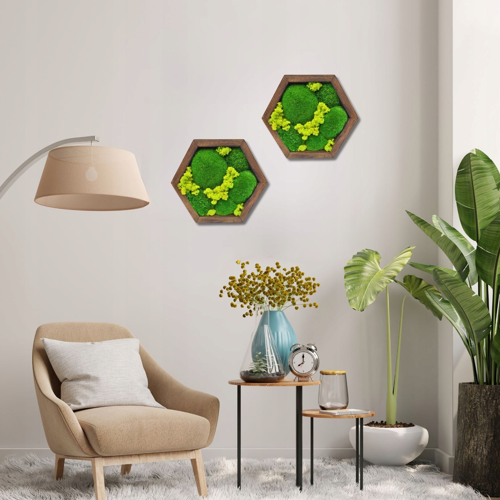 Представляем деревянные стеновые панели с натуральным стабилизированным мхом в форме шестиугольника.