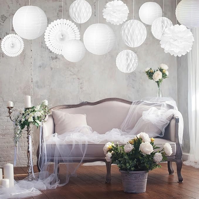 - Декоративные элементы: фонари с белой бумагой, помпоны, помпоны, вентиляторы
