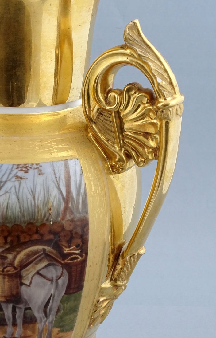 расположены на квадратном постаменте, с круглой ножкой и узкой ножкой, переходящей над ней в широкую ножку. , стройное тулово, слегка расширяющееся вверху, цилиндрическое и позолоченное, с отвернутым воротником. На животах две сцены с охотничьими мотивами, охотниками и животными, на заднем плане – пышная растительность. По бокам две ручки с узором в виде листьев и ракушек аканта.