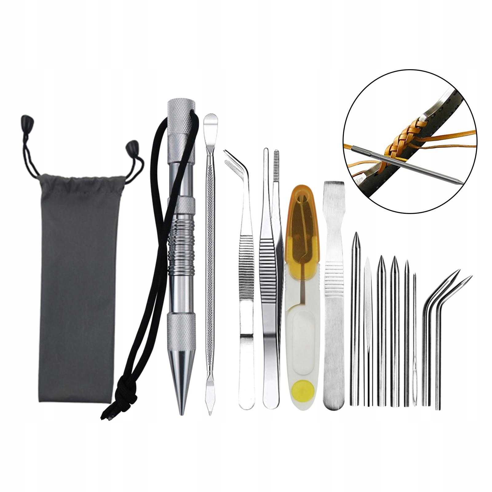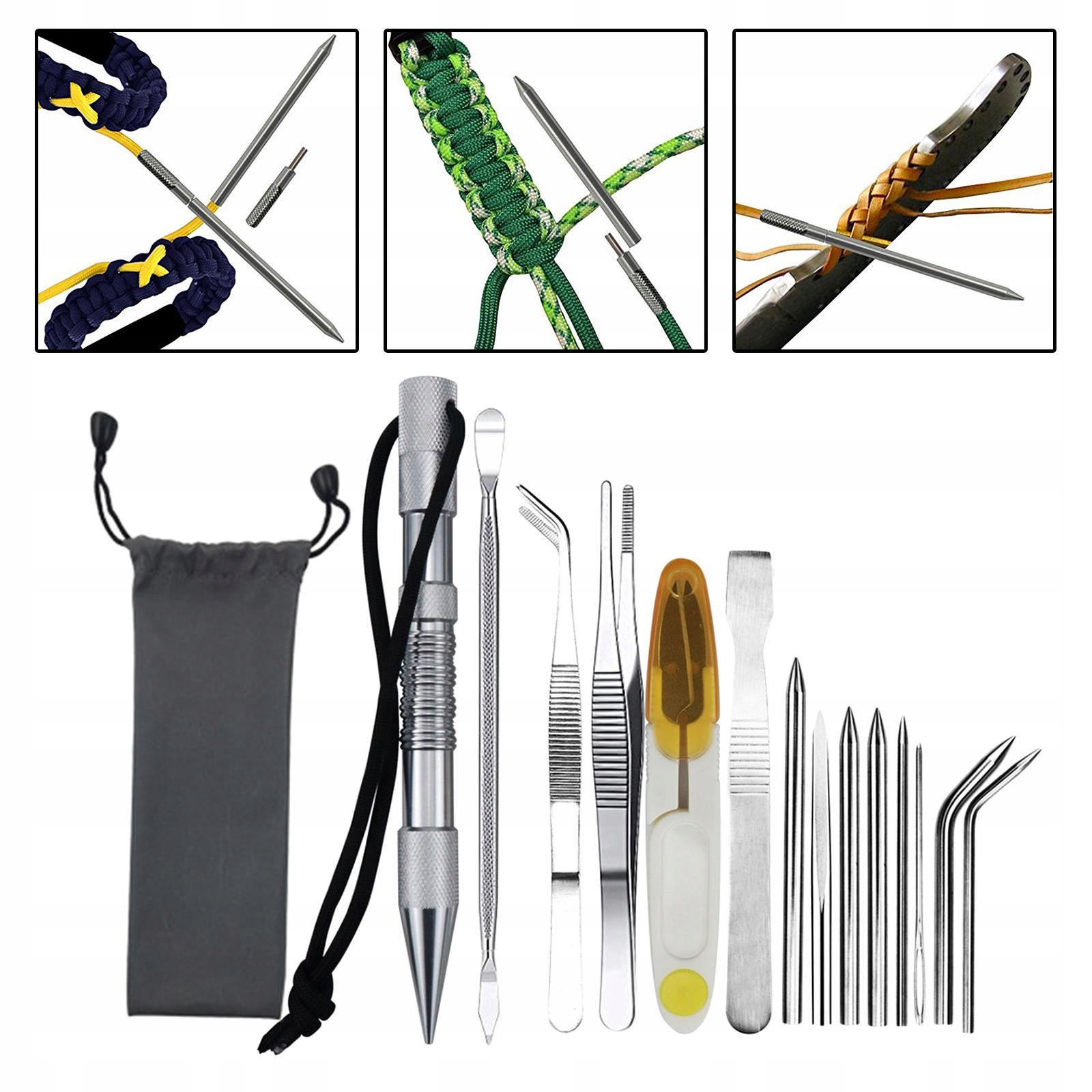 11 кусочков: 4 просты 13 кусочков: 1 Марин Колин, 1 штифт, 3 иглы для кружевной прямой струны (3/5/6 мм), 2 иглы (3/5 мм), 1 игла с плоской головкой с плоской струной (5 мм), 1 игл с отверстием, 1 инструмент для сглаживания струны, 1 ножницы, 2 твизеры из нержавеющей стали (прямая + изогнутая)