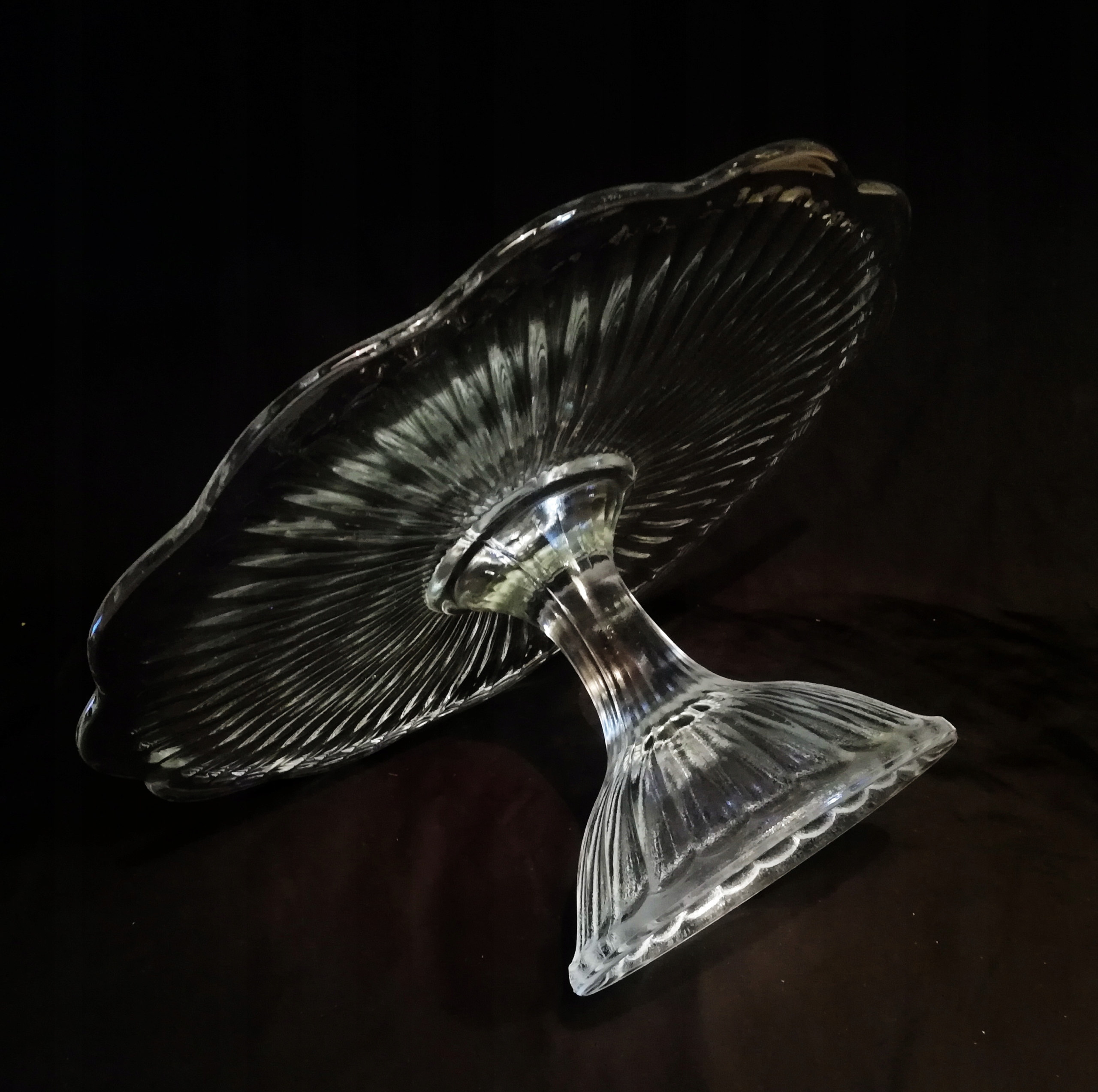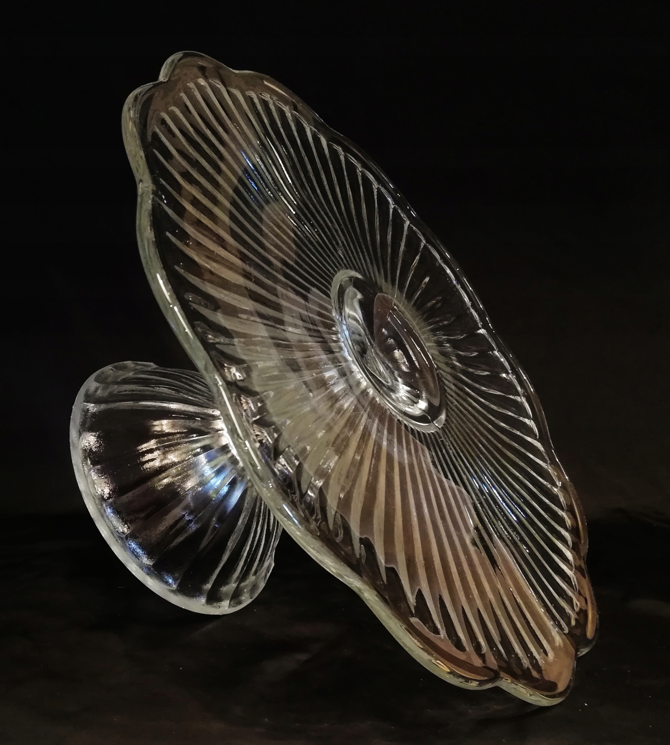 бесцветный, прозрачный, прессованный, диаметр 29 см, высота 13,5 см, диаметр основания 12,5 см