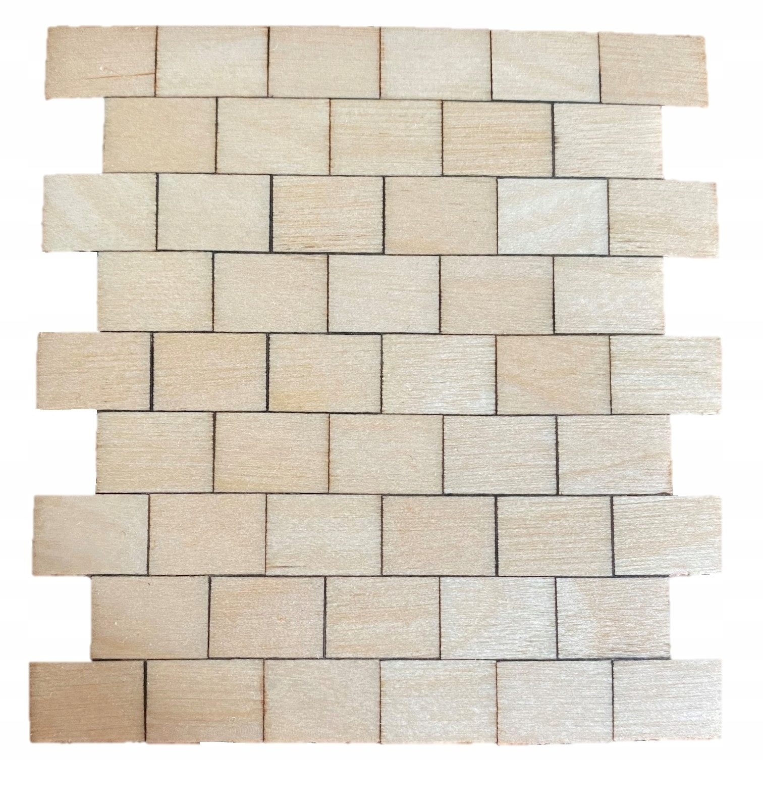 Элементы изготовлены из фанеры толщиной 3 мм. Паркет может быть приклеен непосредственно к кирпичам или на картонную коробку. После склеивания элементов можно покрыть небольшие зазоры, а затем отшлифовать тонкой наждачной бумагой, которая будет прикреплена к элементам. Для склеивания лучше всего использовать деревянные клей или офисные клей.